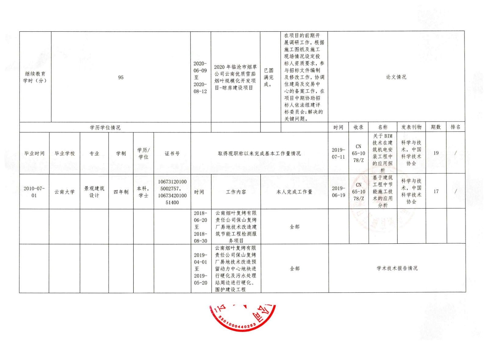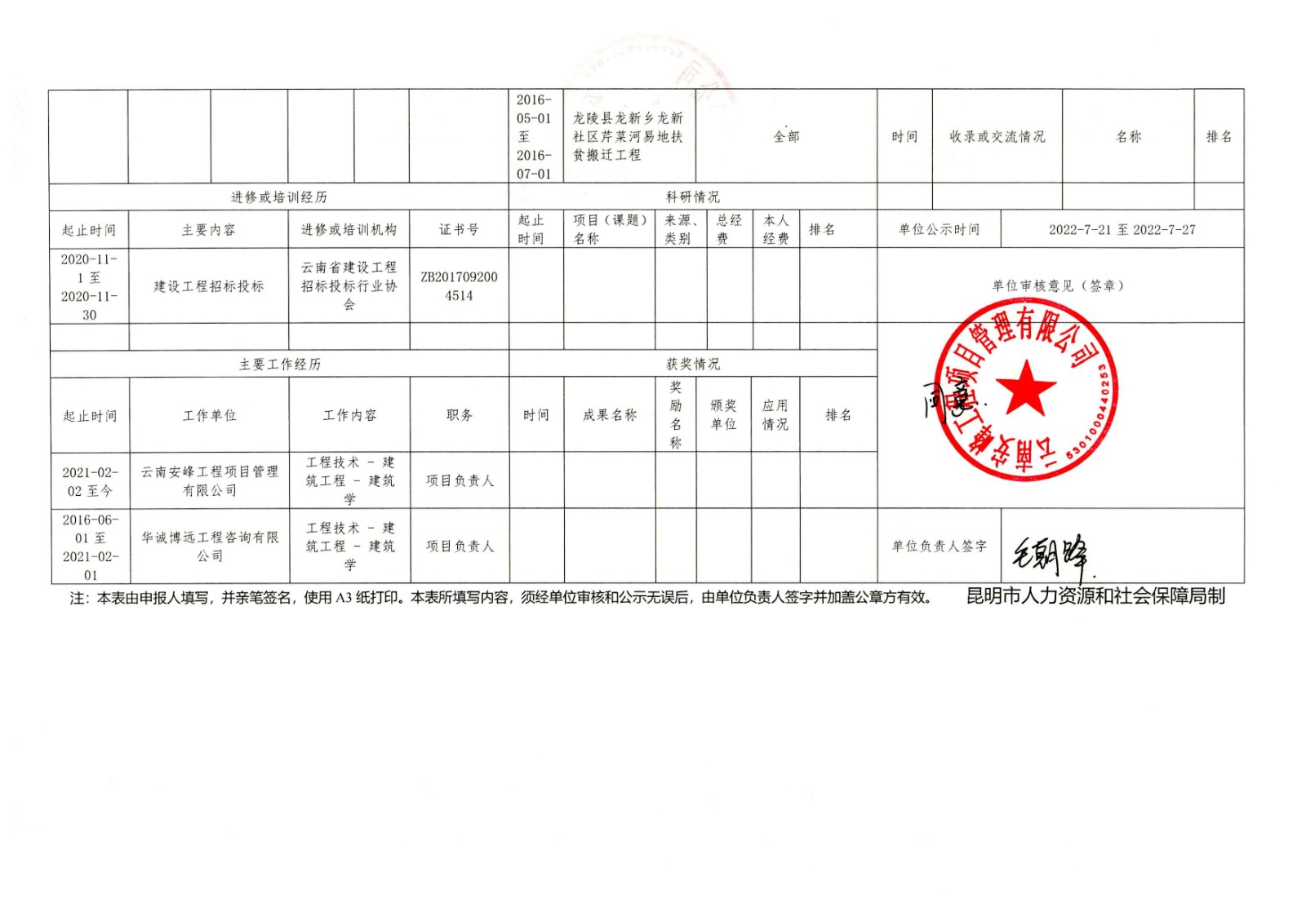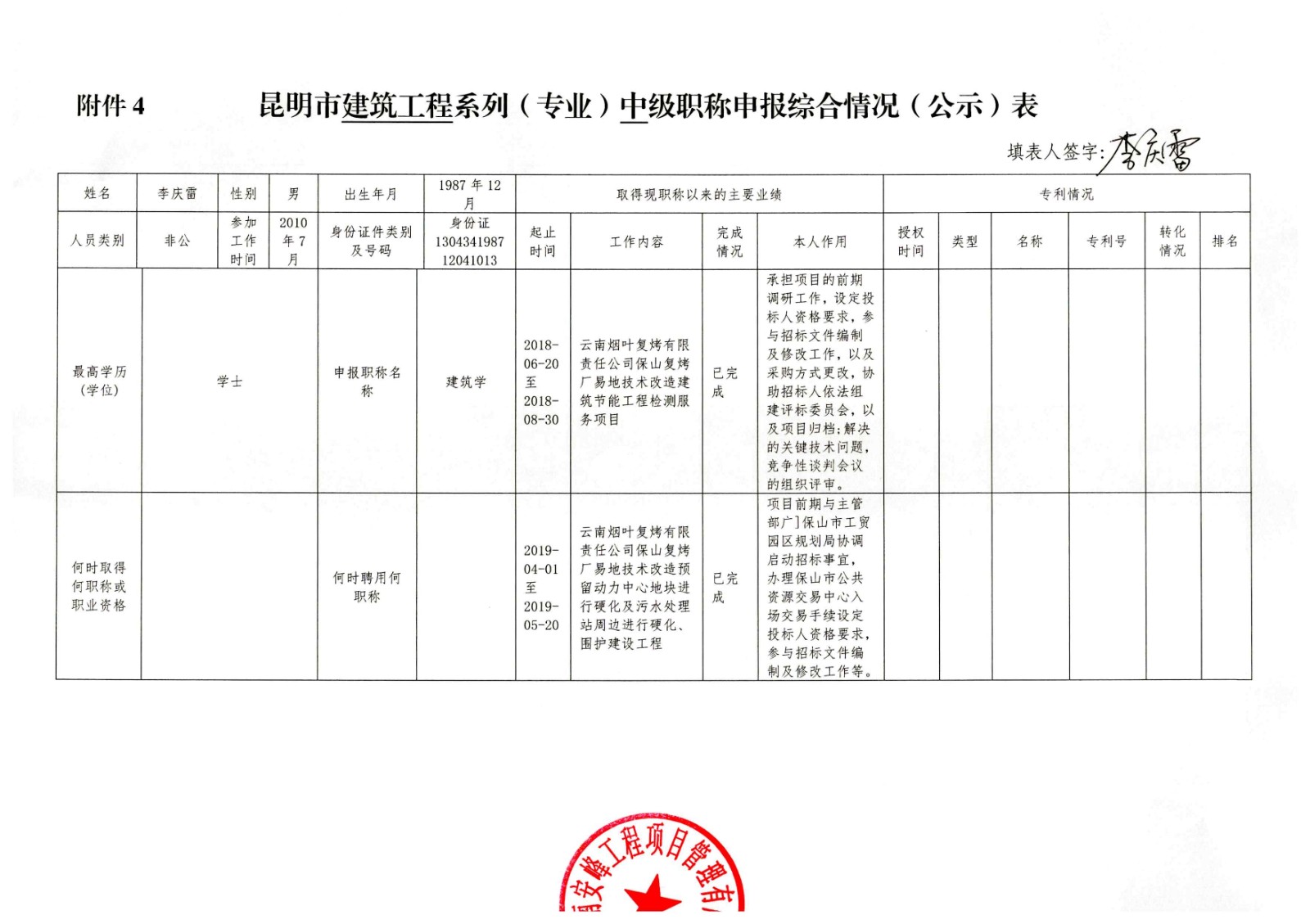關于云南安峰工程項目管理有限公司員工李慶雷申報建筑工程系列(專業)中級職稱情況公示