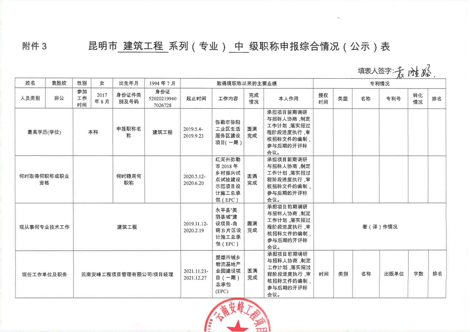 關(guān)于云南安峰工程項(xiàng)目管理有限公司員工袁勝姣申報(bào)建筑工程系列(專業(yè))中級(jí)職稱情況公示