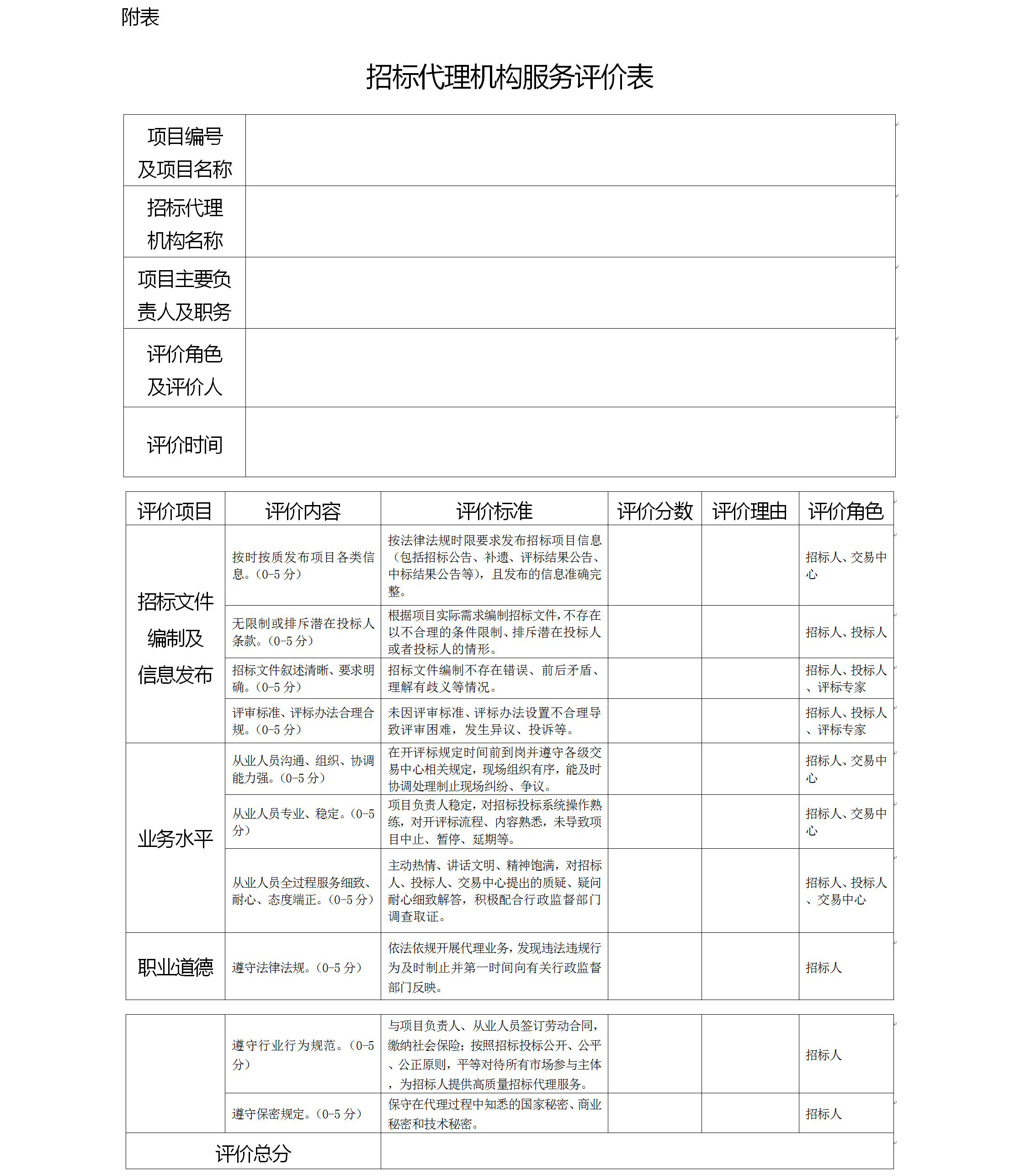 附表:招標代理機構服務評價表