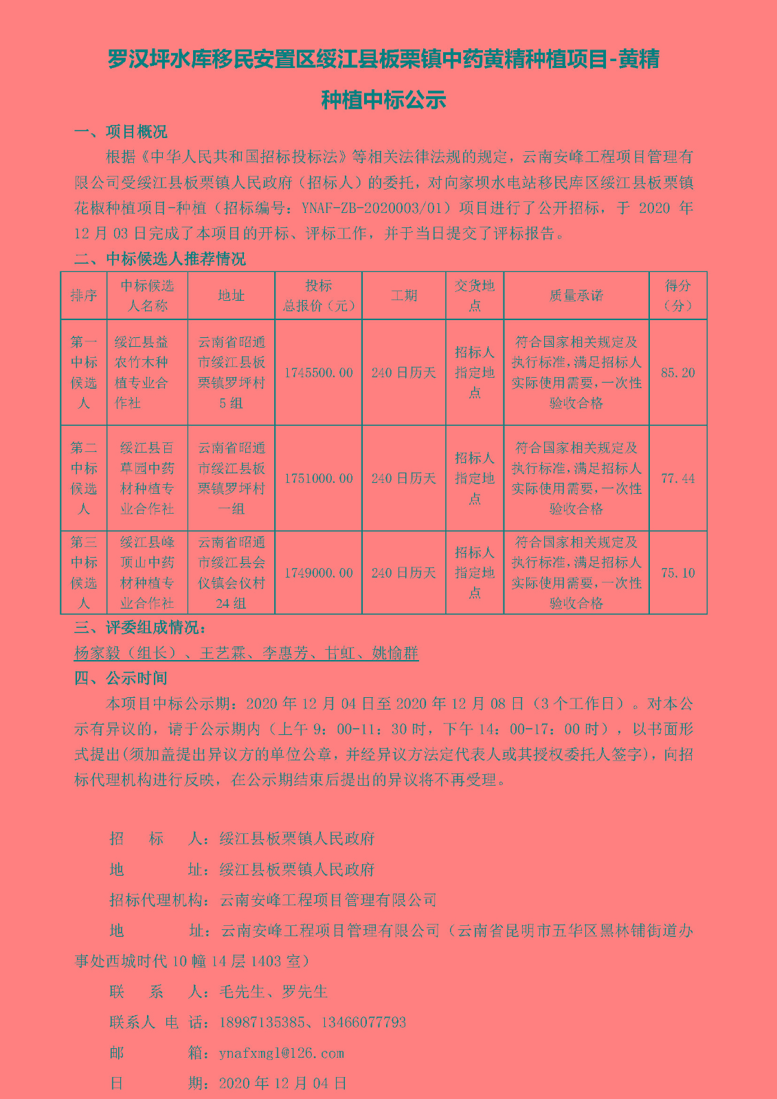 羅漢坪水庫移民安置區綏江縣板栗鎮中藥黃精種植項目-配套基礎設施建設中標公示