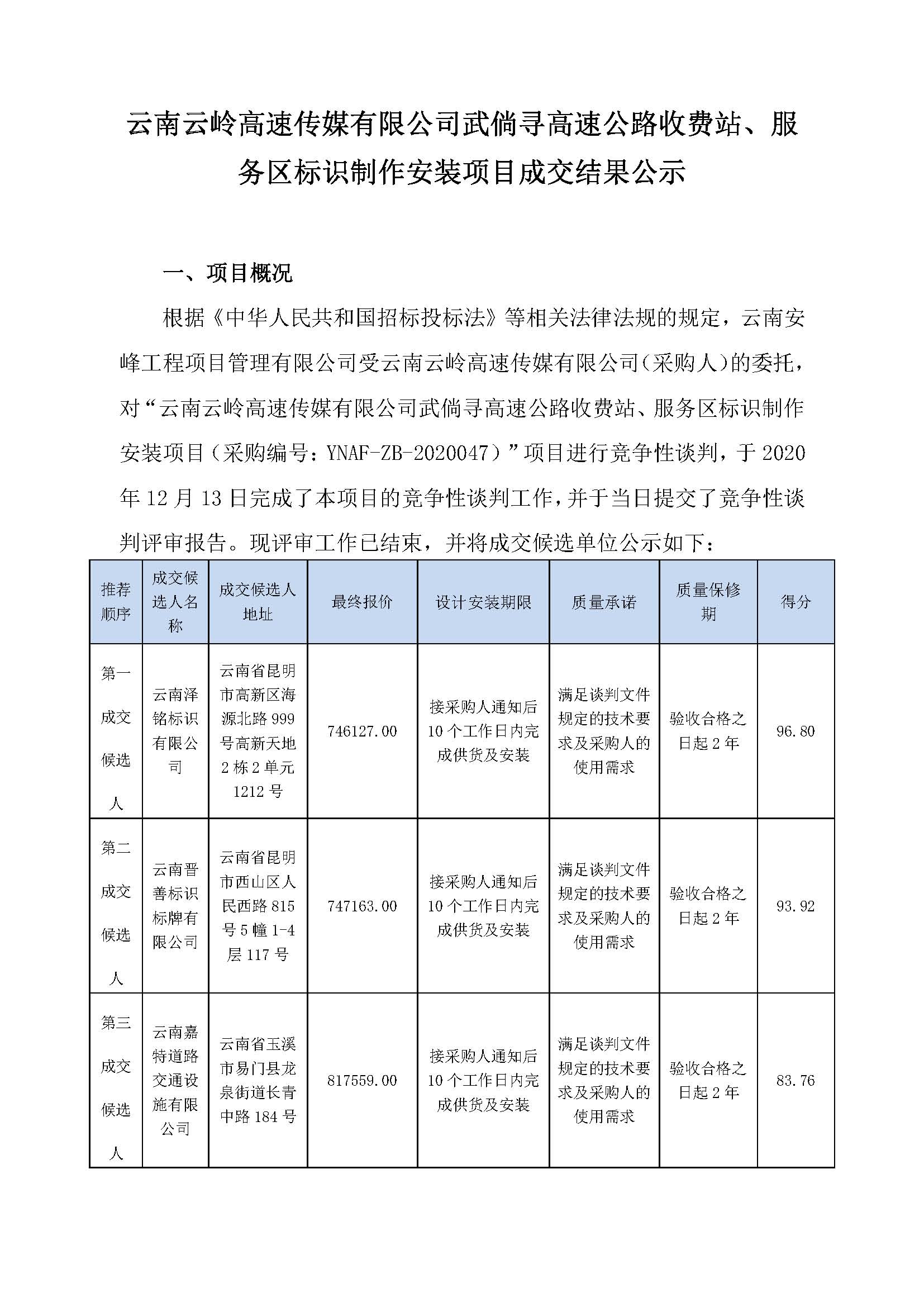 云南云嶺高速傳媒有限公司武倘尋高速公路收費站、服務區標識制作安裝項目成交結果公示