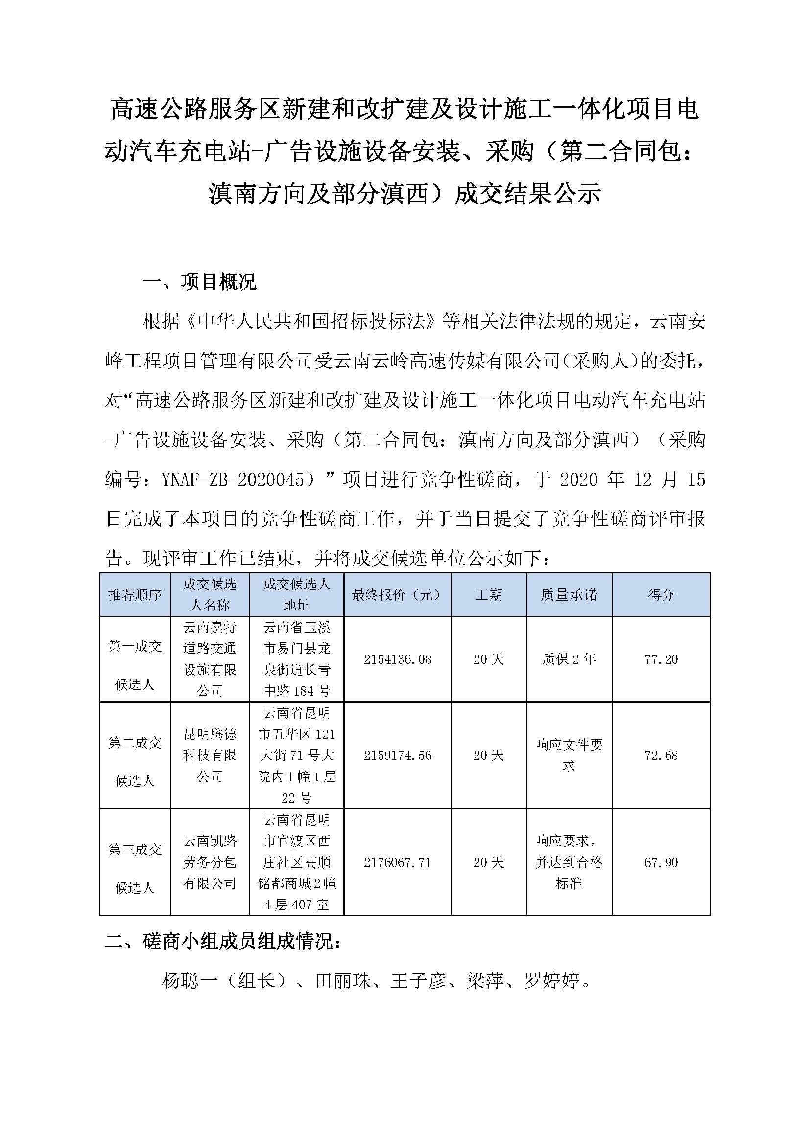 高速公路服務區新建和改擴建及設計施工一體化項目電動汽車充電站-廣告設施設備安裝、采購(第二合同包:滇南方向及部分滇西)成交結果公示