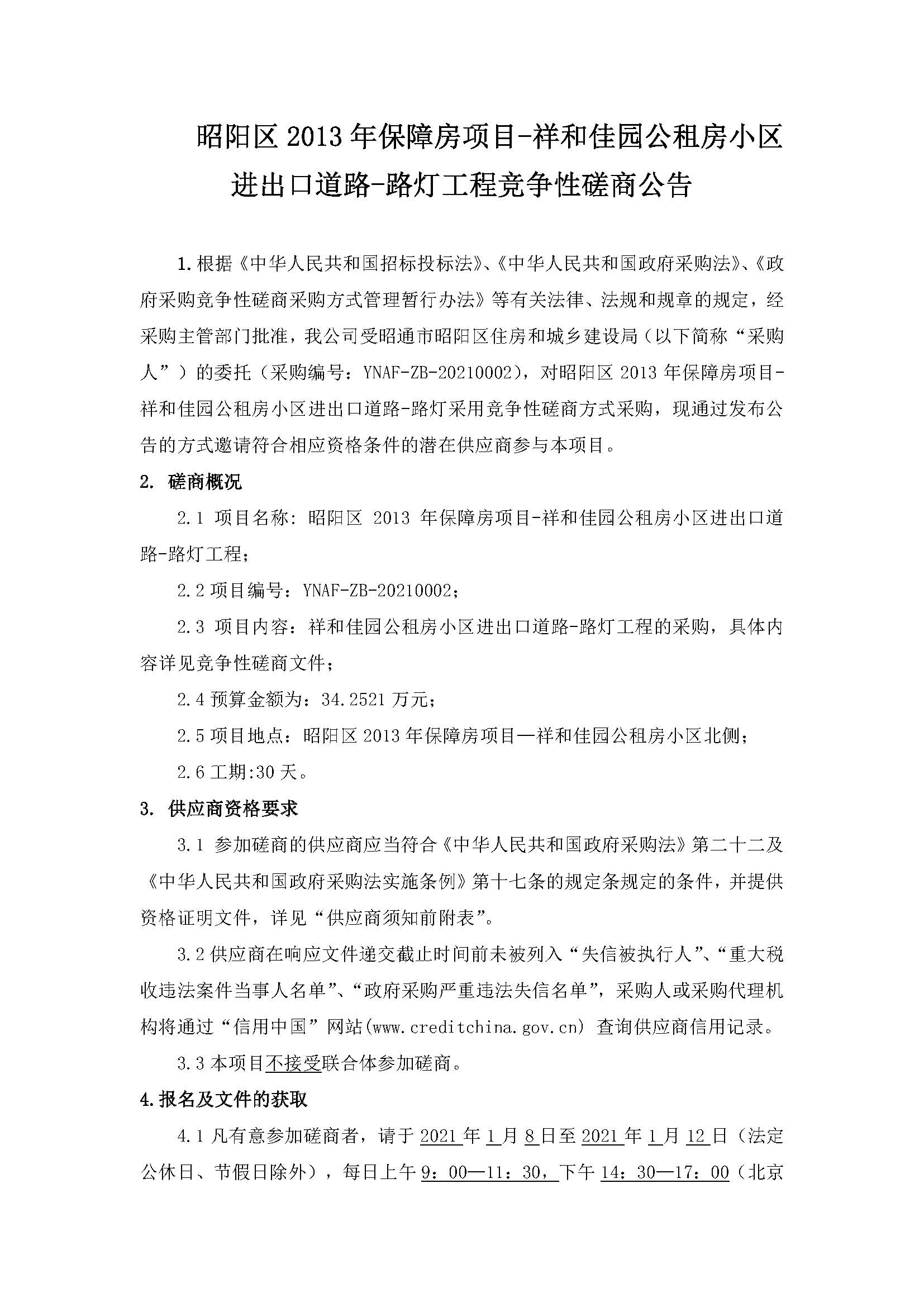 昭陽區2013年保障房項目-祥和佳園公租房小區進出口道路-路燈工程競爭性磋商公告