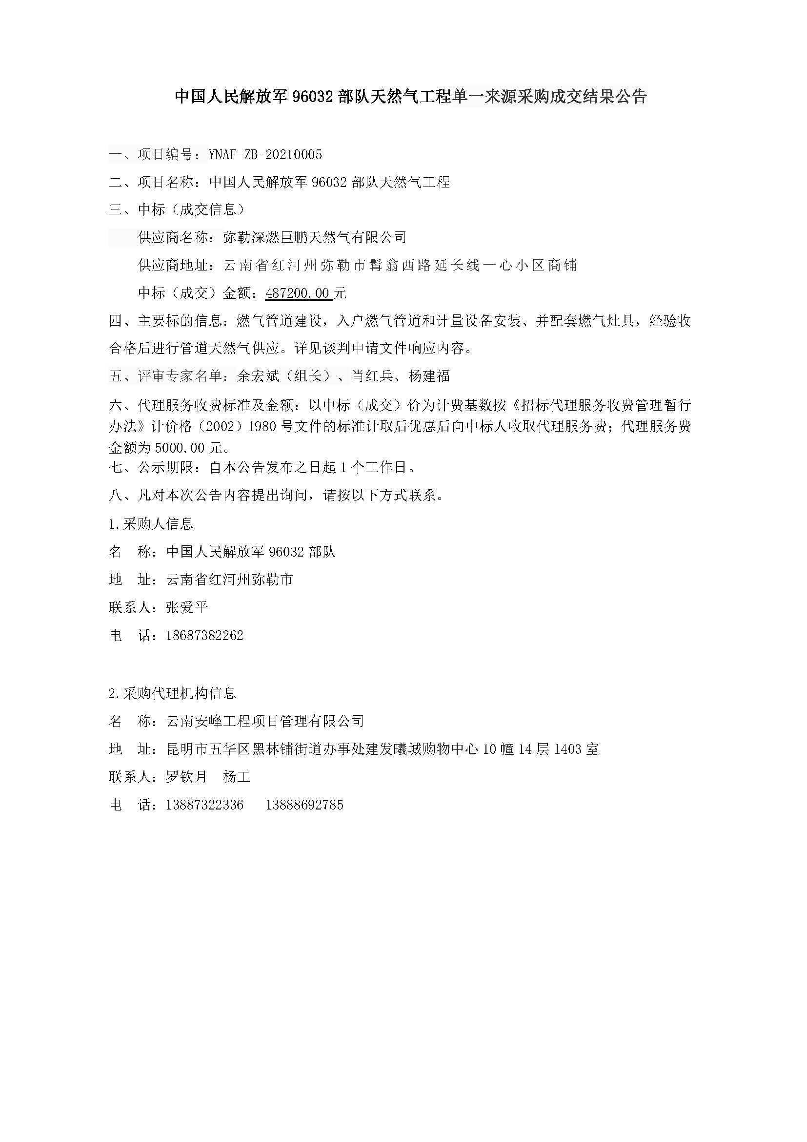 中國人民解放軍96032部隊天然氣工程單一來源采購成交結果公告