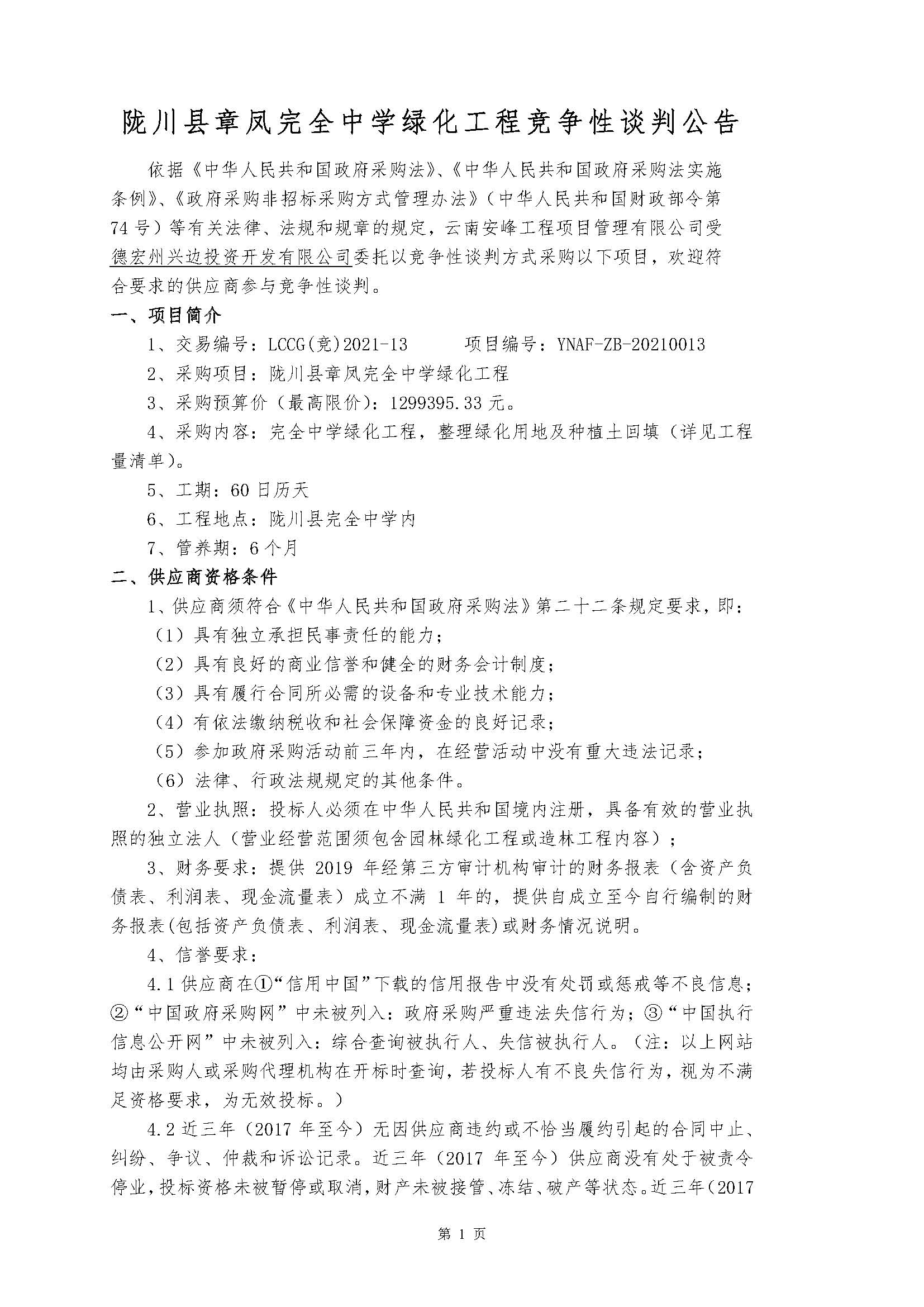 隴川縣章鳳完全中學綠化工程競爭性談判公告