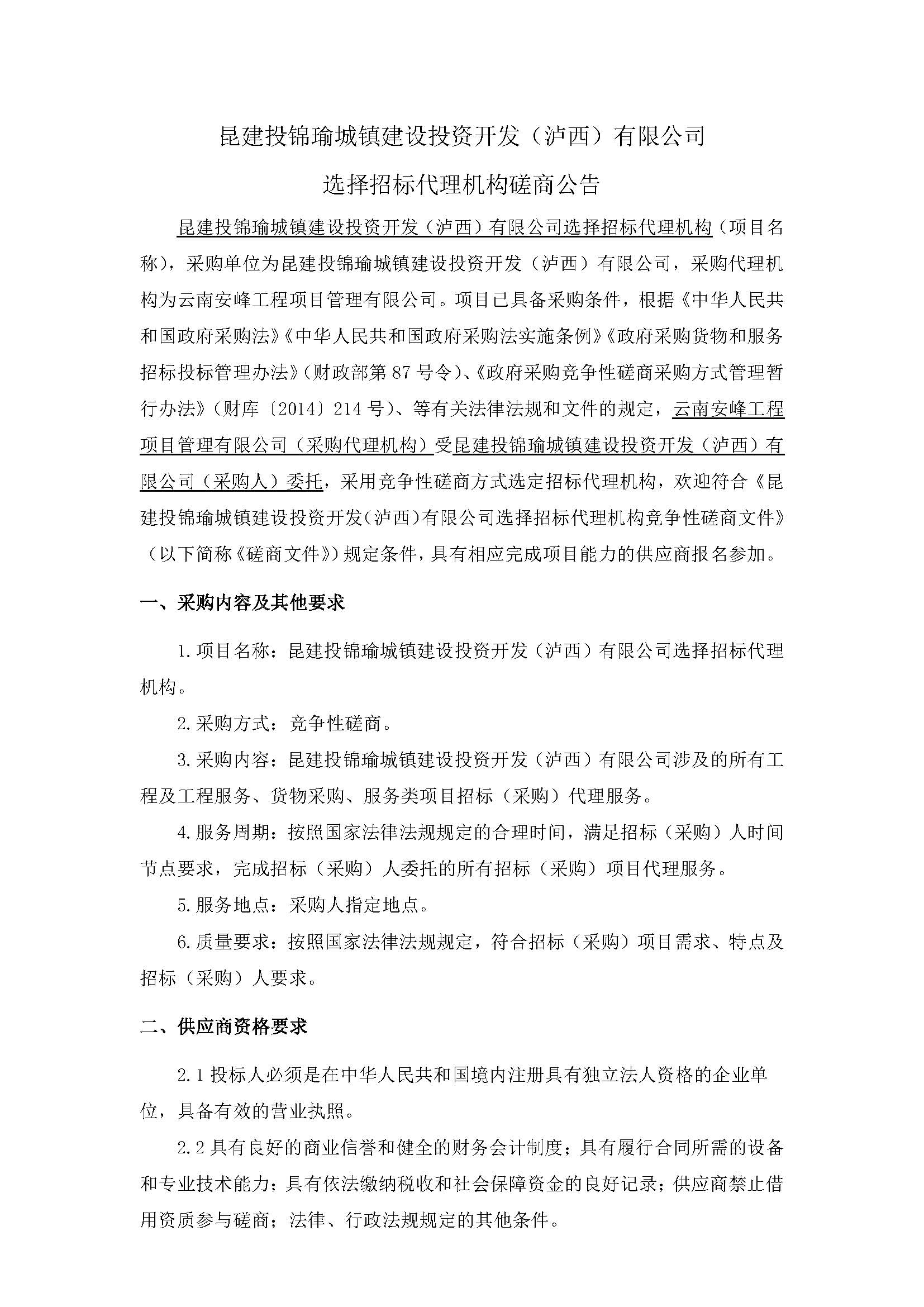 昆建投錦瑜城鎮建設投資開發(瀘西)有限公司 選擇招標代理機構磋商