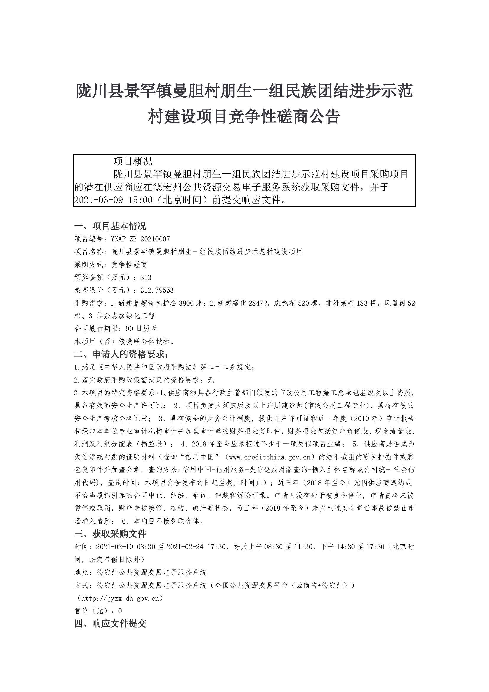 隴川縣景罕鎮(zhèn)曼膽村朋生一組民族團結進步示范村建設項目競爭性磋商公告