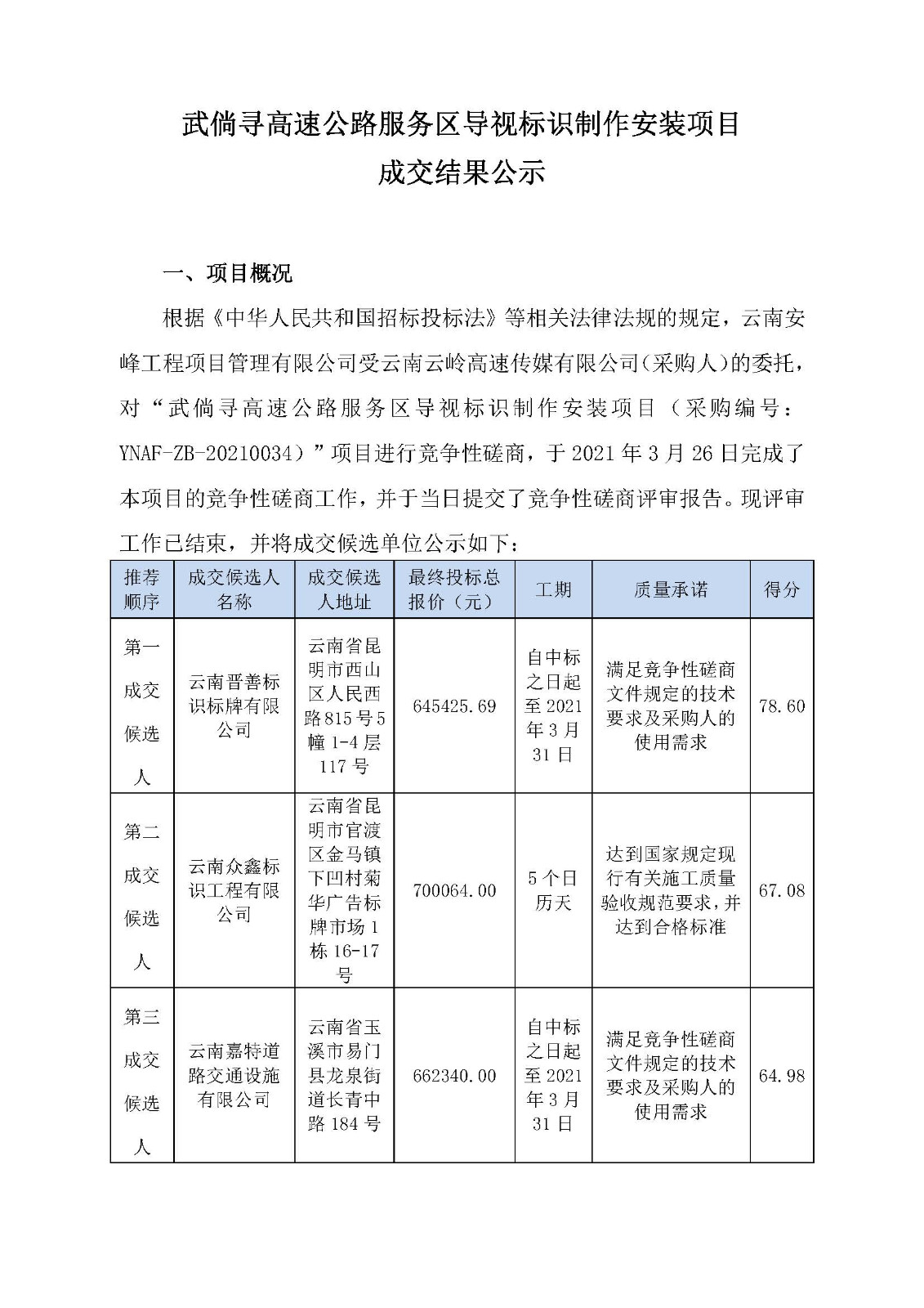 武倘尋高速公路服務區導視標識制作安裝項目成交結果公示