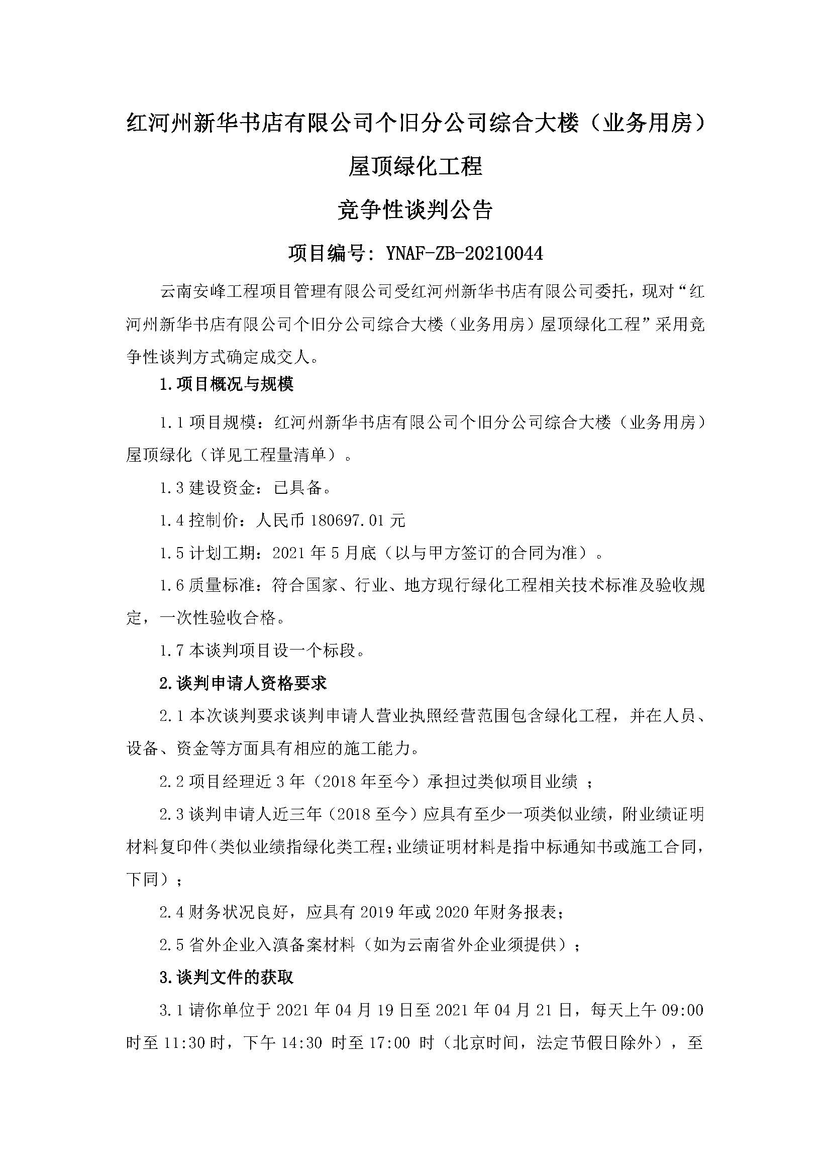 紅河州新華書(shū)店有限公司個(gè)舊分公司綜合大樓(業(yè)務(wù)用房)屋頂綠化工程競(jìng)爭(zhēng)性談判公告