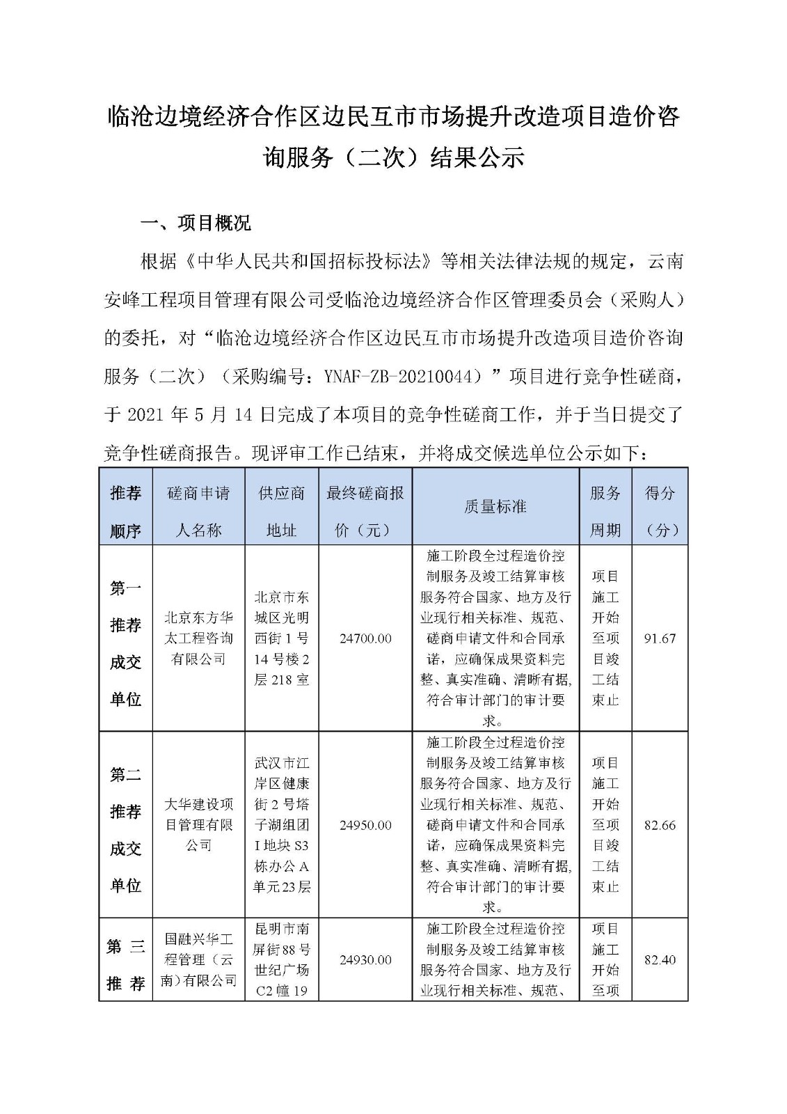 臨滄邊境經(jīng)濟(jì)合作區(qū)邊民互市市場(chǎng)提升改造項(xiàng)目造價(jià)咨詢服務(wù)(二次)結(jié)果公示