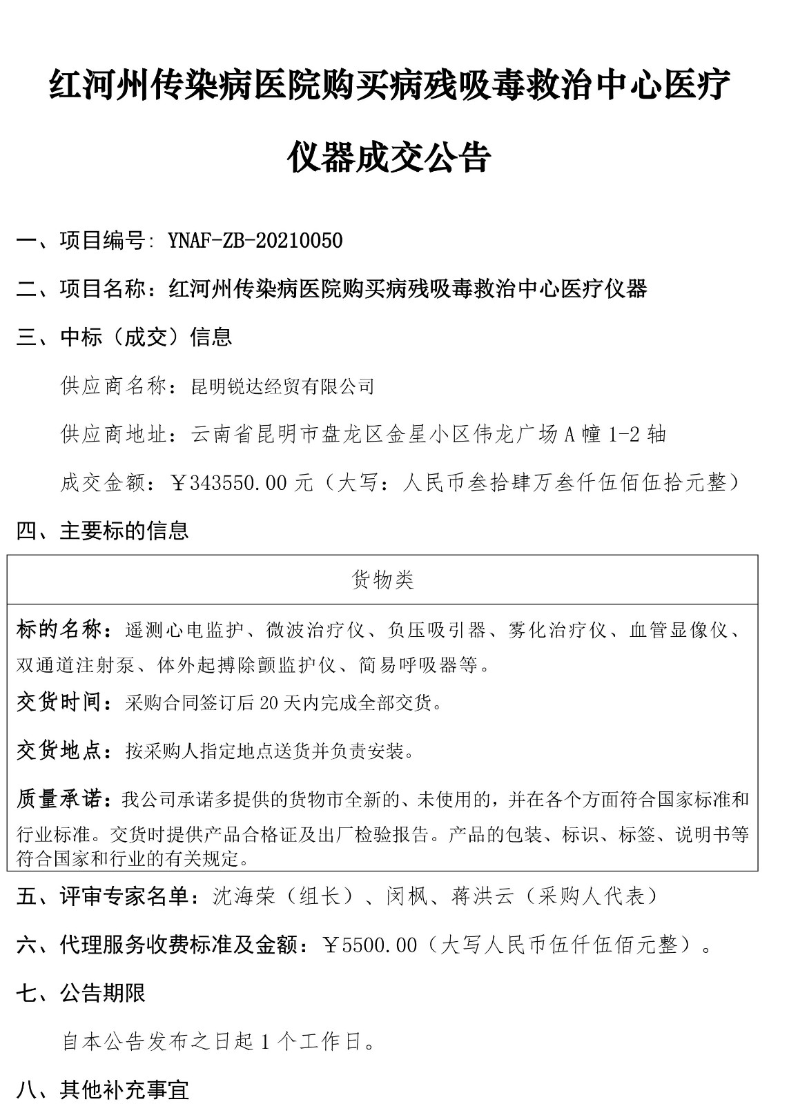 紅河州傳染病醫院購買病殘吸毒救治中心醫療儀器成交公告