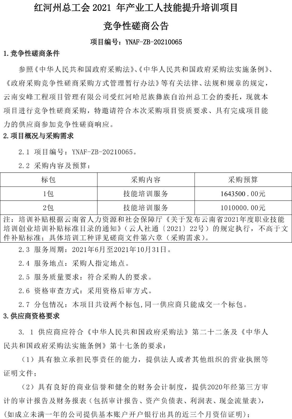 紅河州總工會2021 年產(chǎn)業(yè)工人技能提升培訓項目競爭性磋商公告
