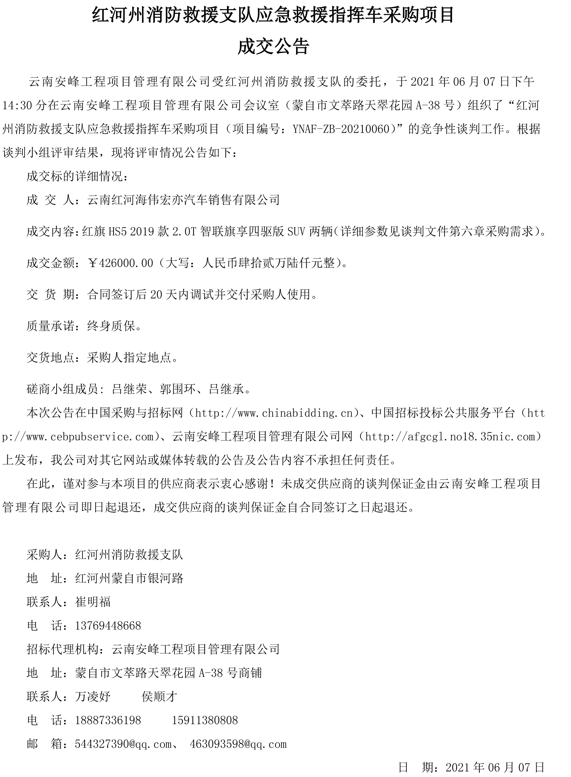 紅河州消防救援支隊(duì)?wèi)?yīng)急救援指揮車采購項(xiàng)目成交公告