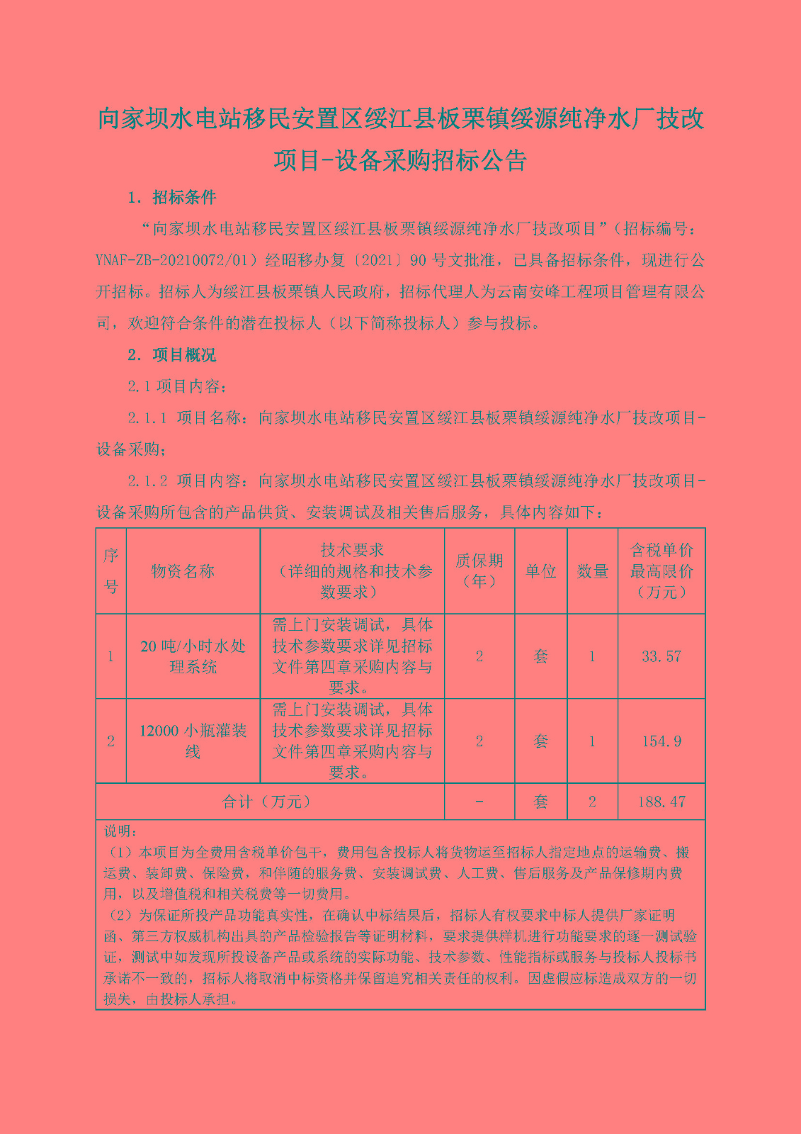 向家壩水電站移民安置區綏江縣板栗鎮綏源純凈水廠技改項目-設備采購招標公告