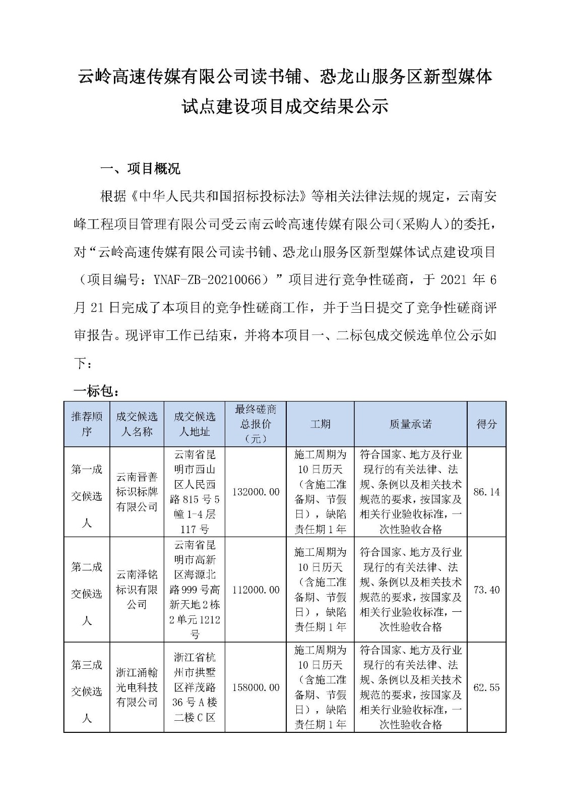 云嶺高速傳媒有限公司讀書鋪、恐龍山服務區新型媒體試點建設項目成交結果公示