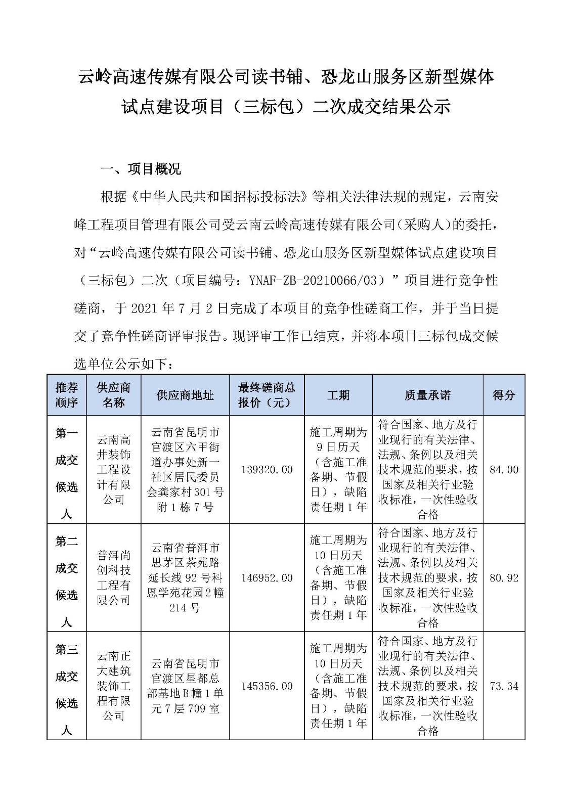 云嶺高速傳媒有限公司讀書鋪、恐龍山服務區新型媒體試點建設項目成交結果公示