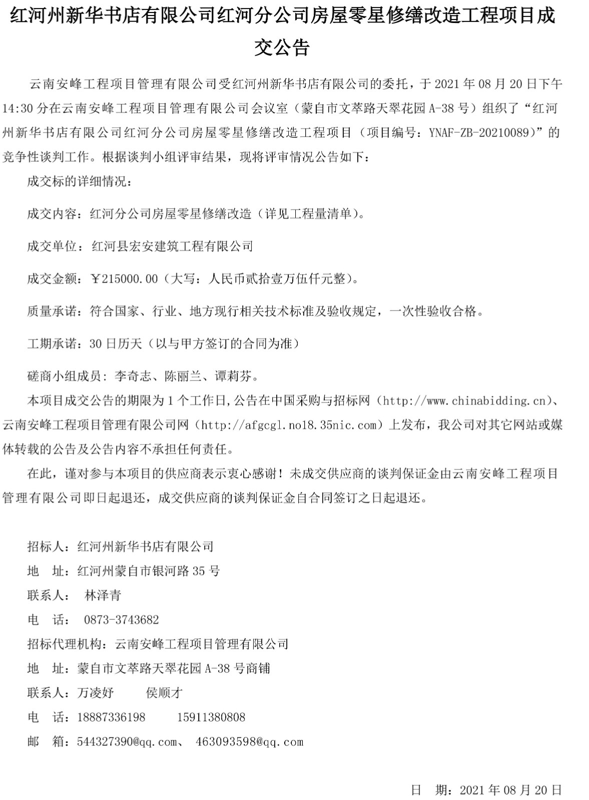紅河州新華書店有限公司紅河分公司房屋零星修繕改造工程項目成交公告