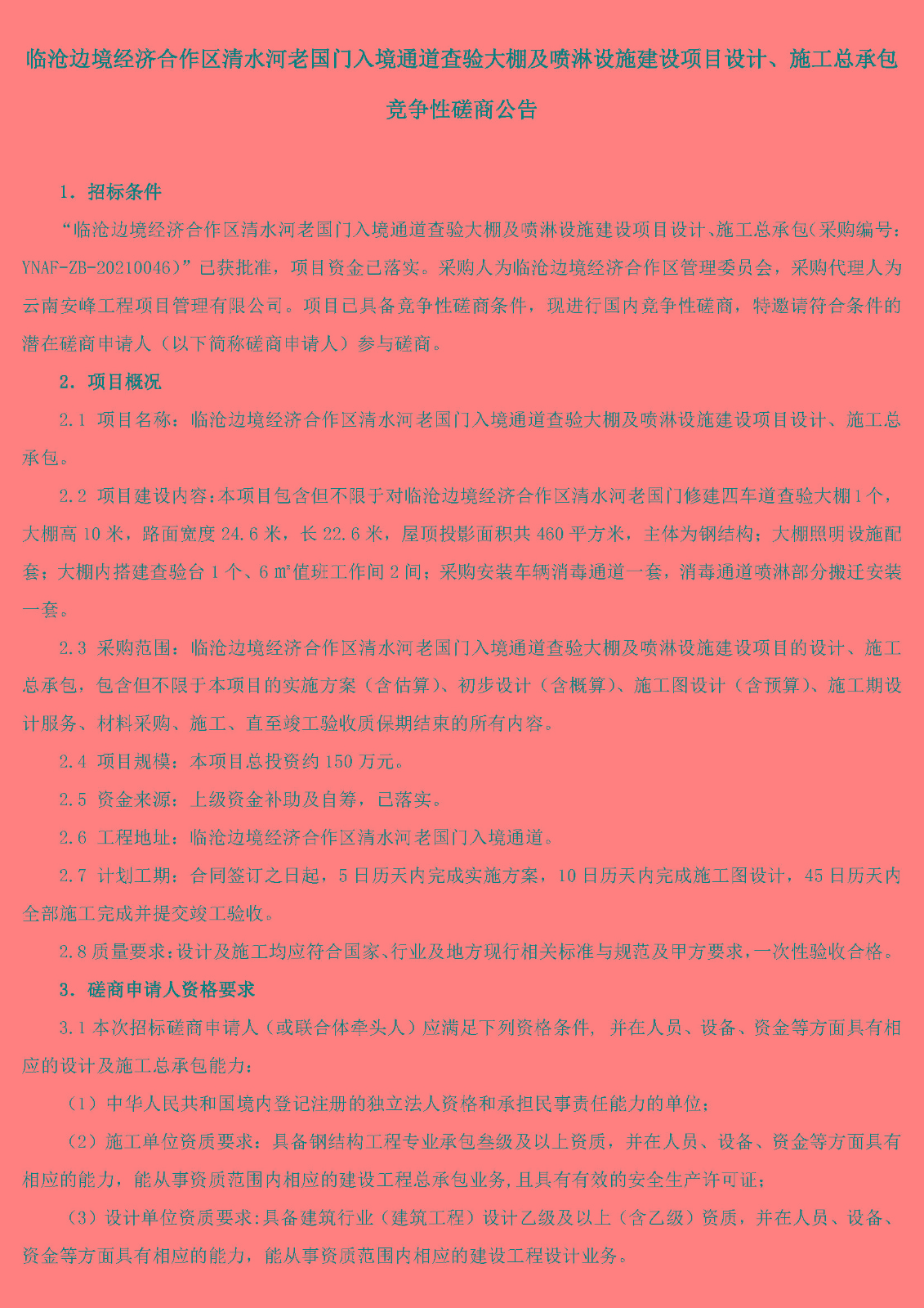 臨滄邊境經濟合作區清水河老國門入境通道查驗大棚及噴淋設施建設項目設計、施工總承包競爭性磋商公告