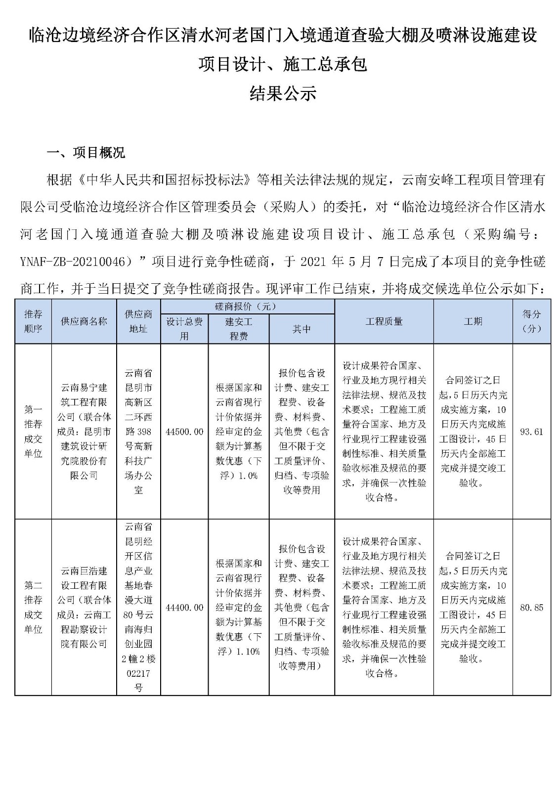 臨滄邊境經濟合作區清水河老國門入境通道查驗大棚及噴淋設施建設項目設計、施工總承包結果公示