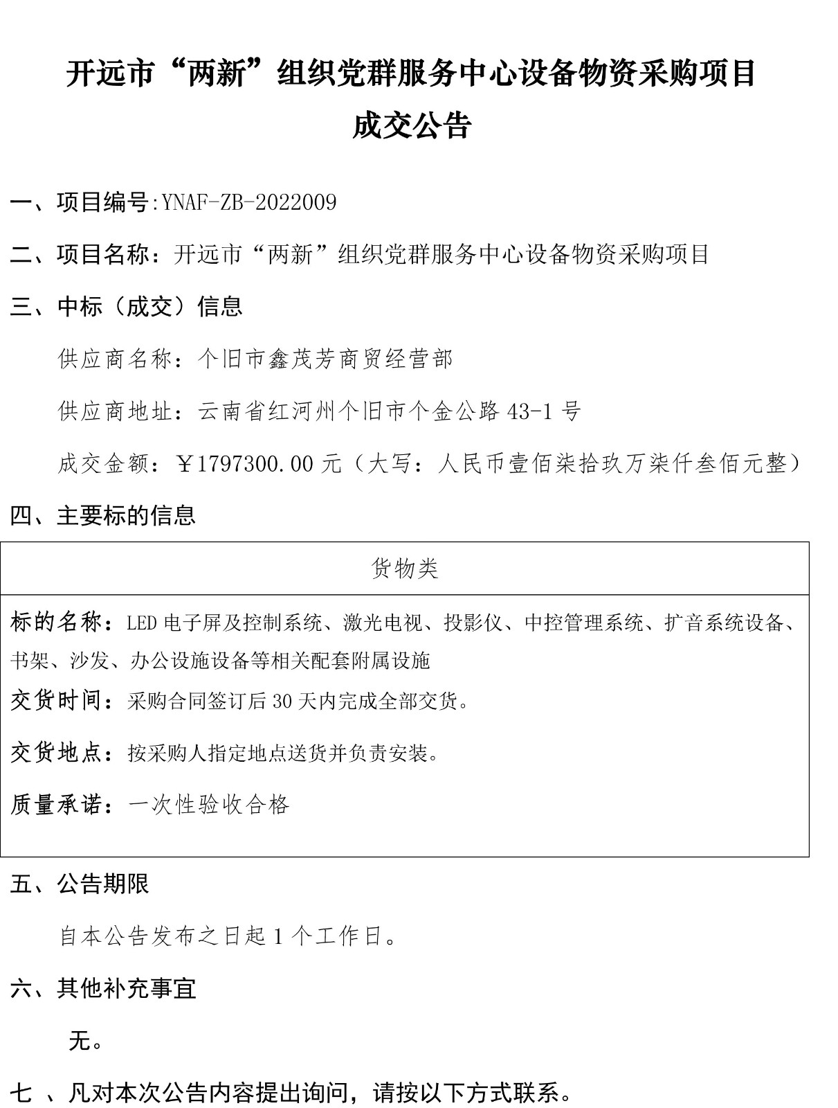 開遠市“兩新”組織黨群服務中心設備物資采購項目成交公告