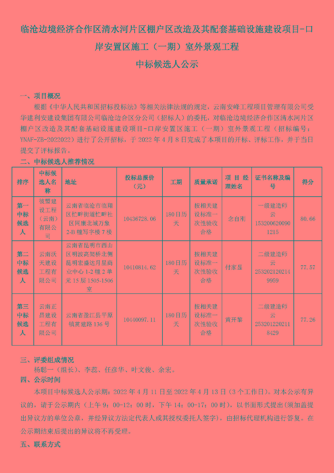 臨滄邊境經(jīng)濟合作區(qū)清水河片區(qū)棚戶區(qū)改造及其配套基礎設施建設項目-口岸安置區(qū)施工(一期)室外景觀工程中標候選人公示