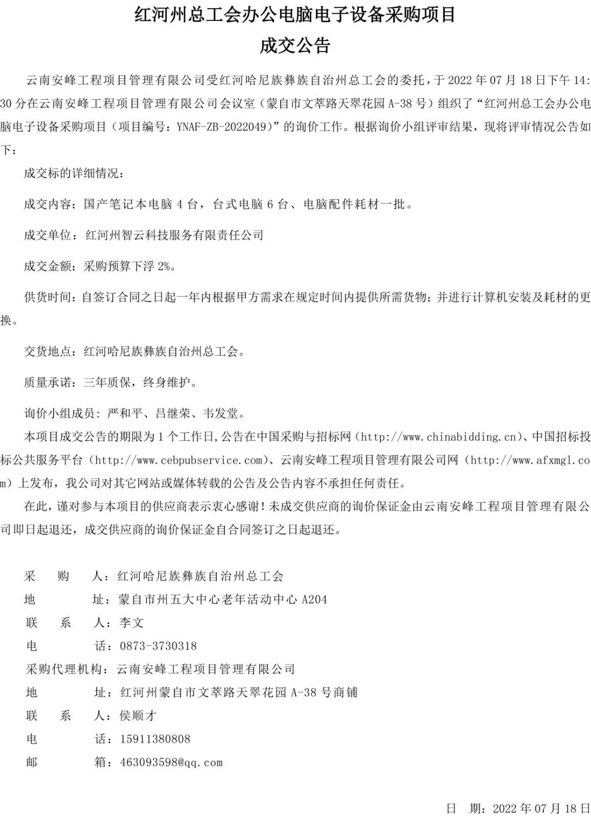 紅河州總工會辦公電腦電子設備采購項目成交公告