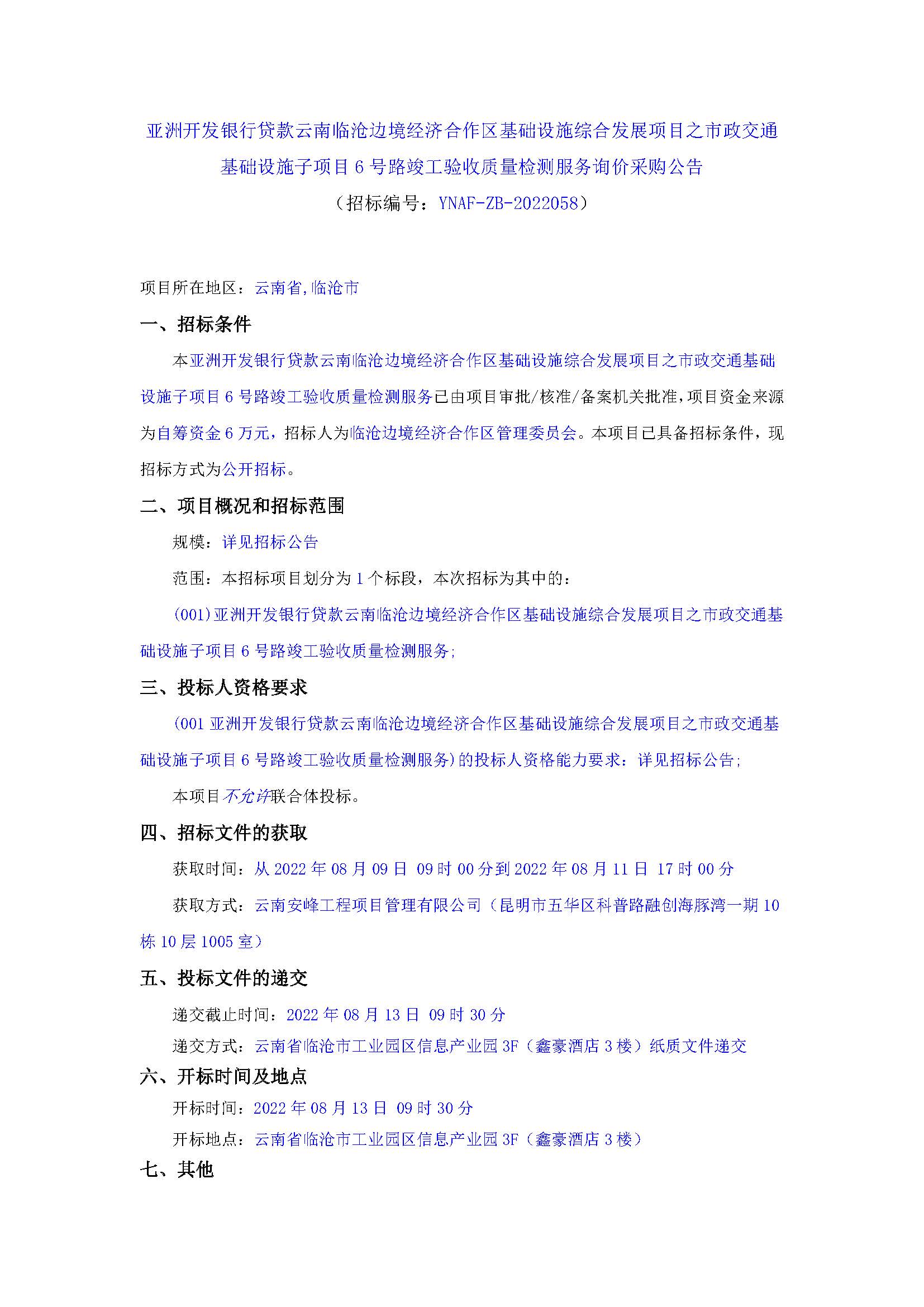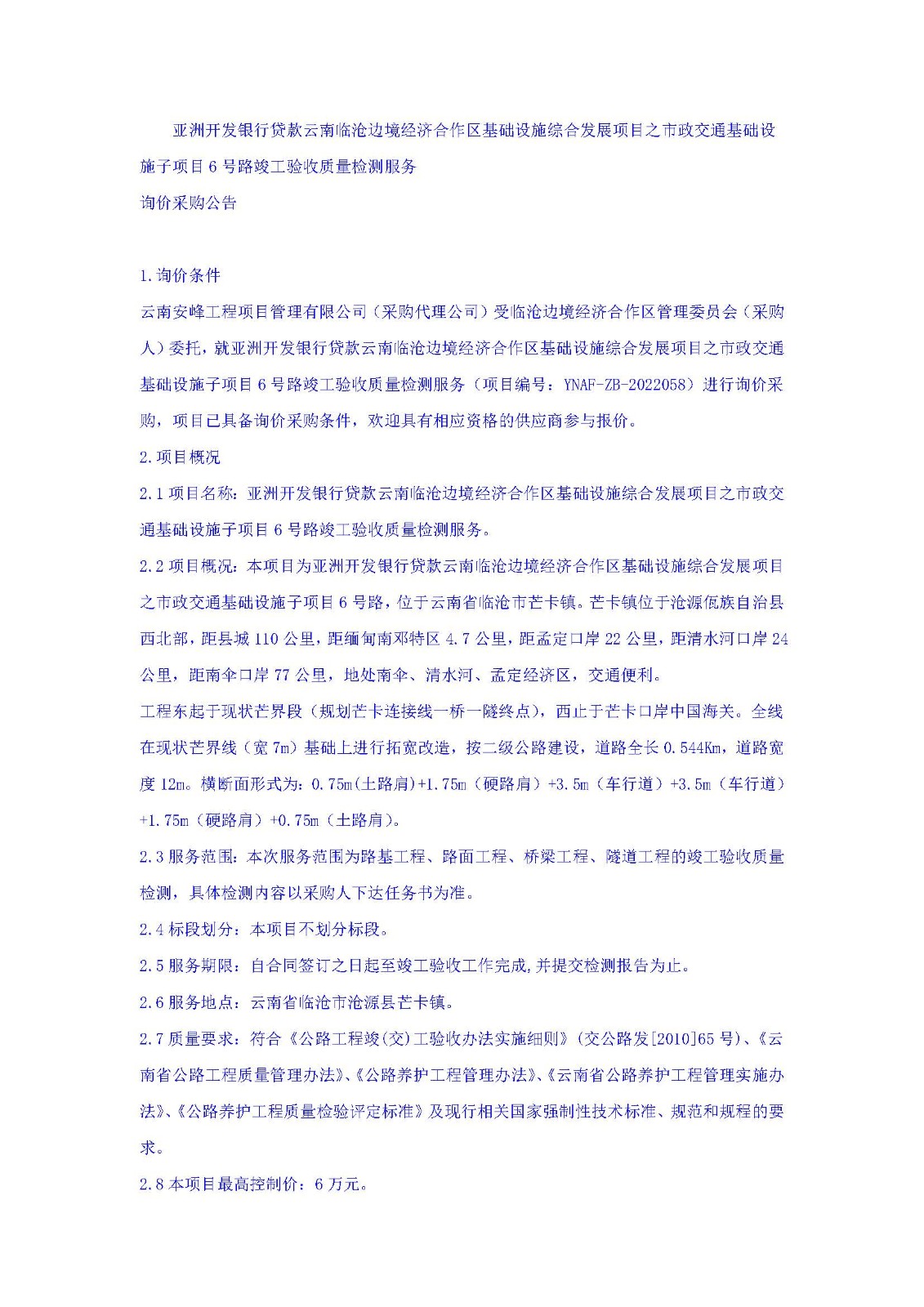 亞洲開(kāi)發(fā)銀行貸款云南臨滄邊境經(jīng)濟(jì)合作區(qū)基礎(chǔ)設(shè)施綜合發(fā)展項(xiàng)目之市政交通基礎(chǔ)設(shè)施子項(xiàng)目6號(hào)路竣工驗(yàn)收質(zhì)量檢測(cè)服務(wù)