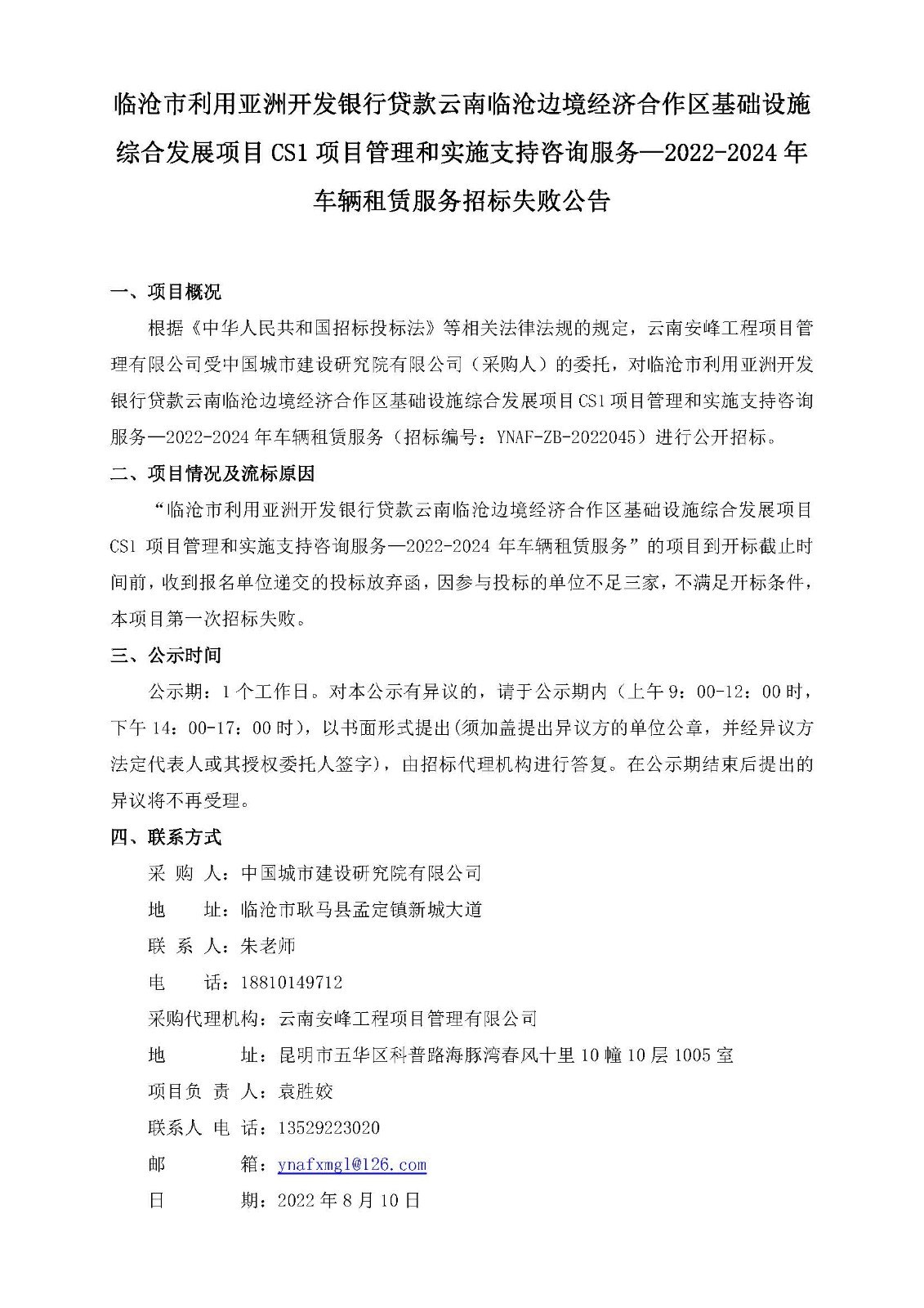 臨滄市利用亞洲開發(fā)銀行貸款云南臨滄邊境經(jīng)濟合作區(qū)基礎(chǔ)設(shè)施綜合發(fā)展項目CS1項目管理和實施支持咨詢服務—2022-2024年車輛租賃服務招標失敗公告