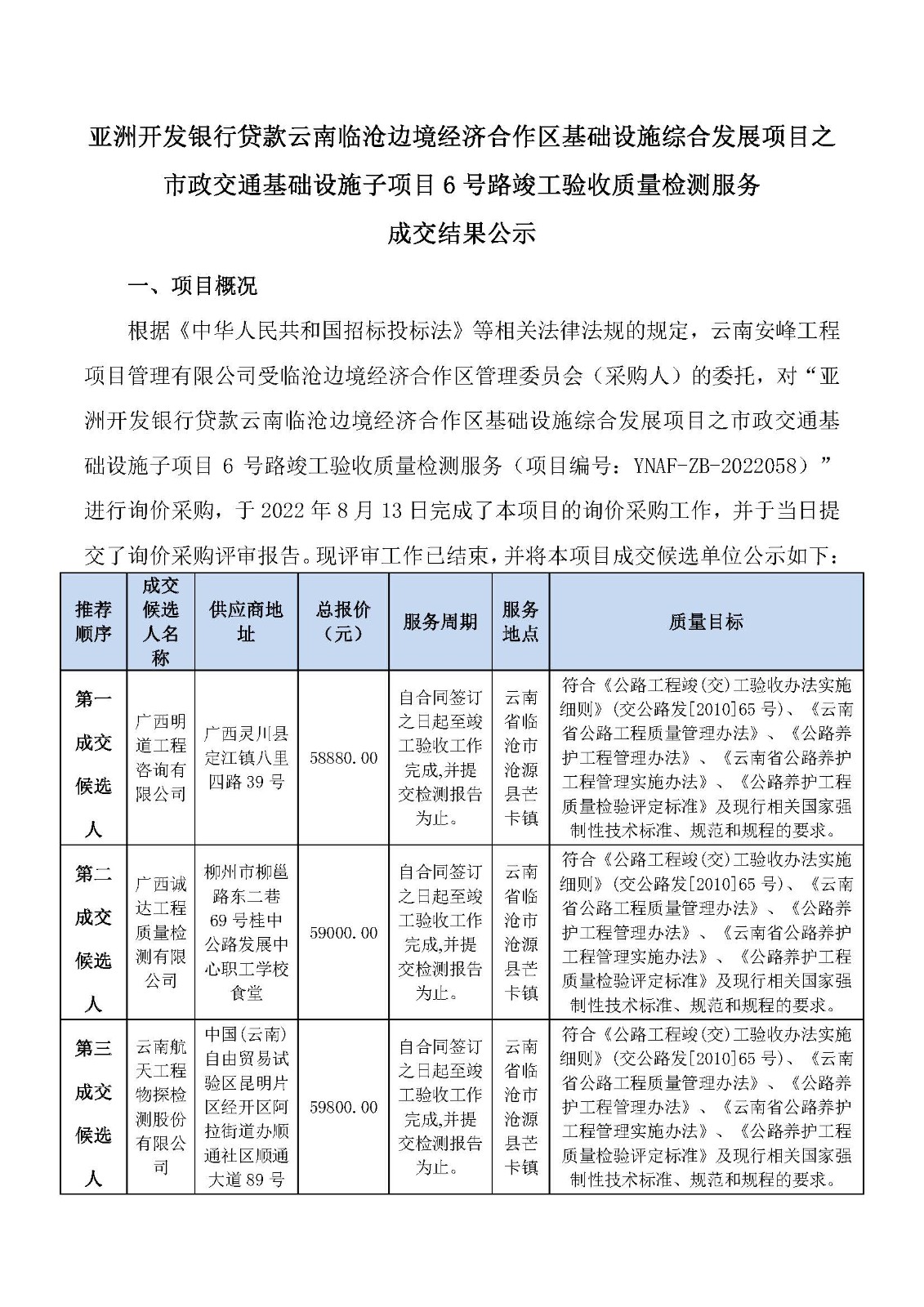 亞洲開(kāi)發(fā)銀行貸款云南臨滄邊境經(jīng)濟(jì)合作區(qū)基礎(chǔ)設(shè)施綜合發(fā)展項(xiàng)目之市政交通基礎(chǔ)設(shè)施子項(xiàng)目6號(hào)路竣工驗(yàn)收質(zhì)量檢測(cè)服務(wù)