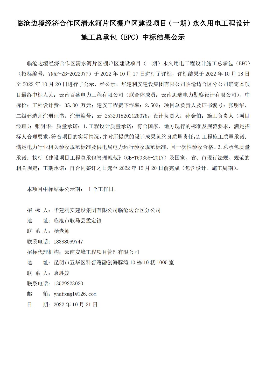 臨滄邊境經(jīng)濟合作區(qū)清水河片區(qū)棚戶區(qū)建設(shè)項目(一期)永久用電工程設(shè)計施工總承包(EPC)中標結(jié)果公示