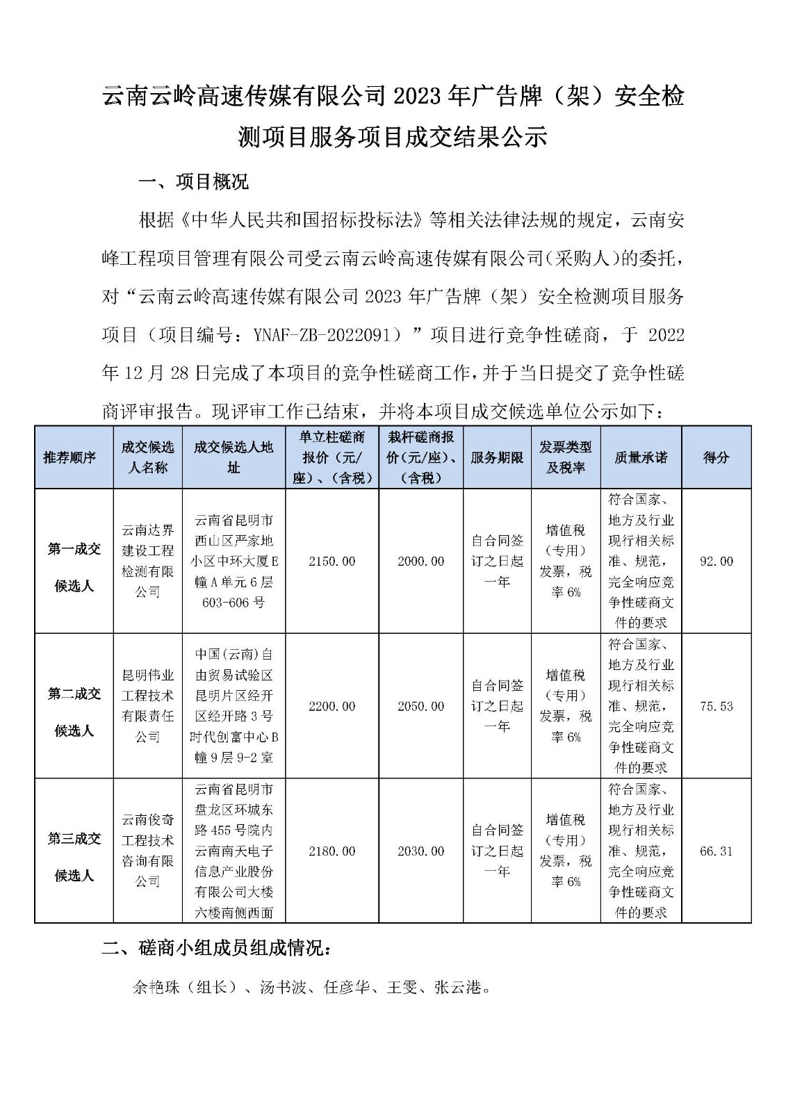 云南云嶺高速傳媒有限公司2023年廣告牌(架)安全檢測項目服務項目成交結果公示