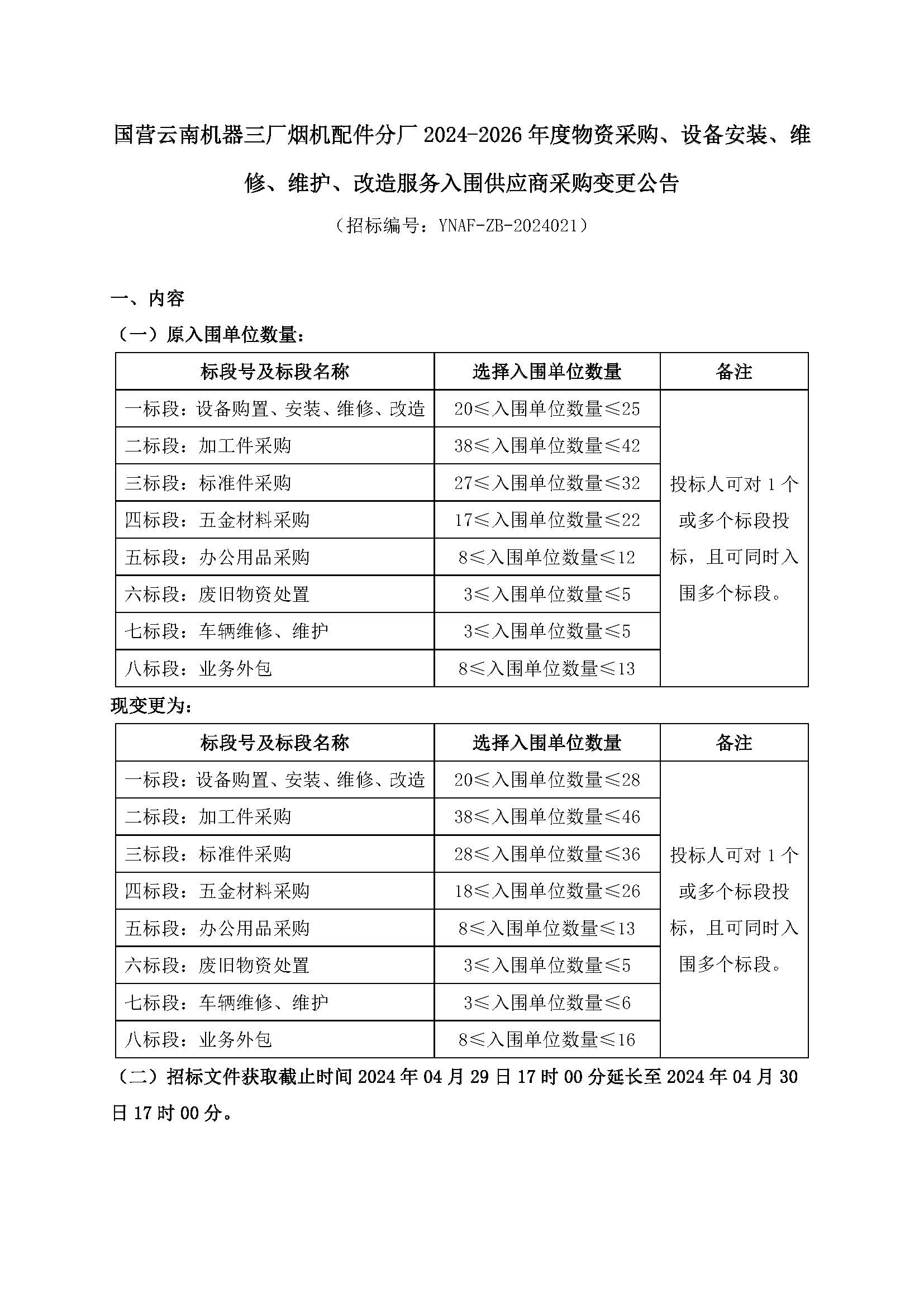 國營云南機器三廠煙機配件分廠2024-2026年度物資采購、設備安裝、維修、維護、改造服務入圍供應商采購變更公告