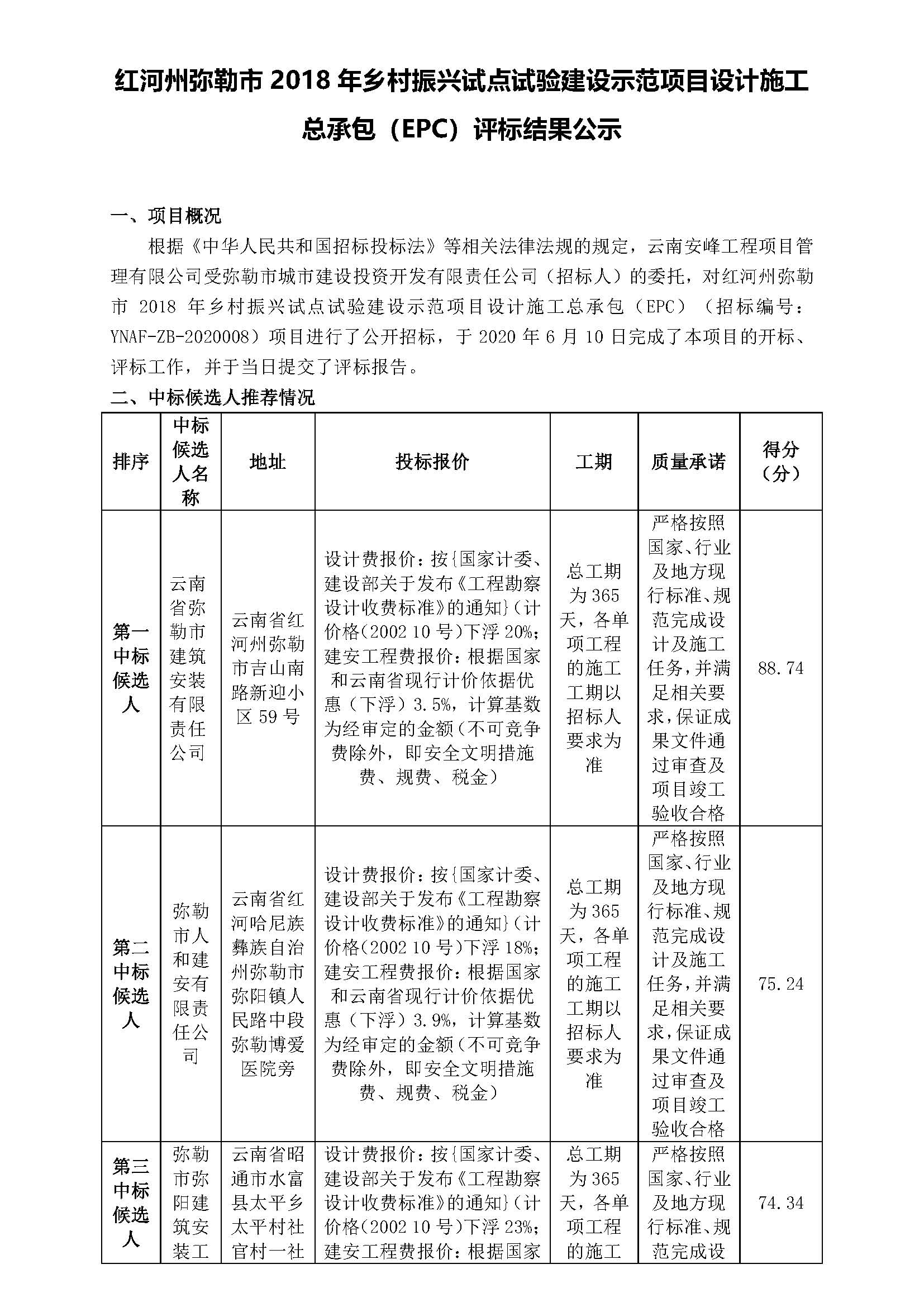 紅河州彌勒市2018年鄉村振興試點試驗建設示范項目設計施工總承包(EPC)評標結果公示