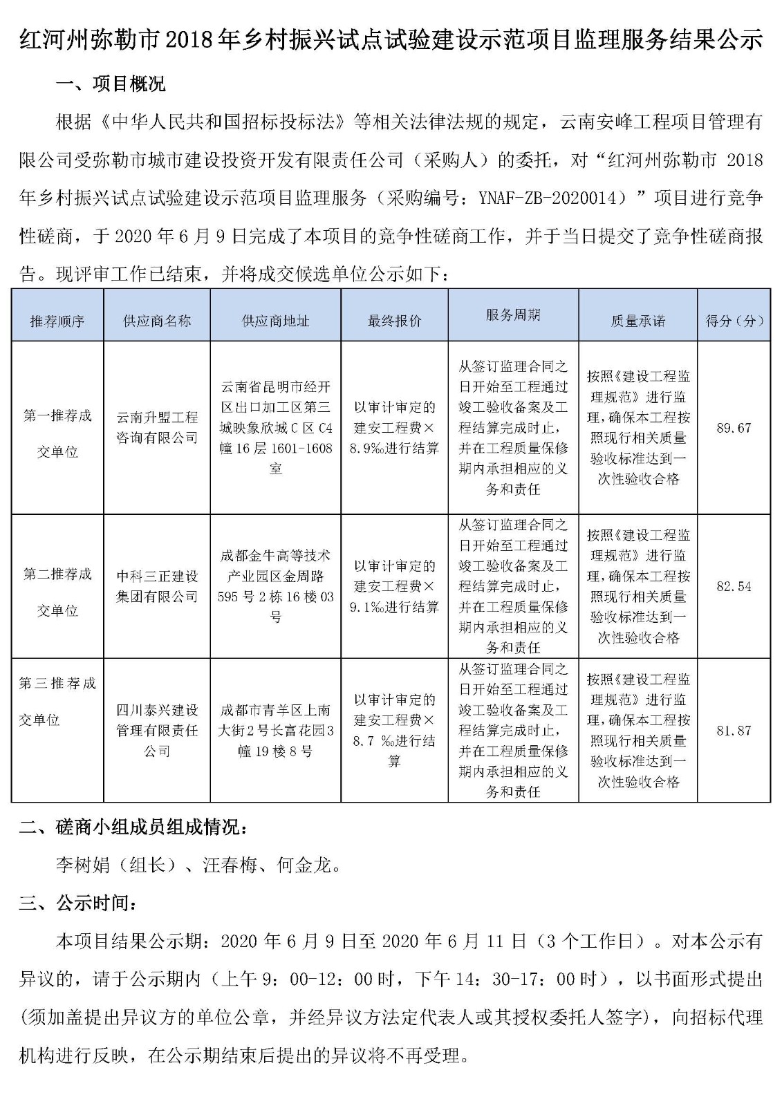 紅河州彌勒市2018年鄉村振興試點試驗建設示范項目監理服務結果公示