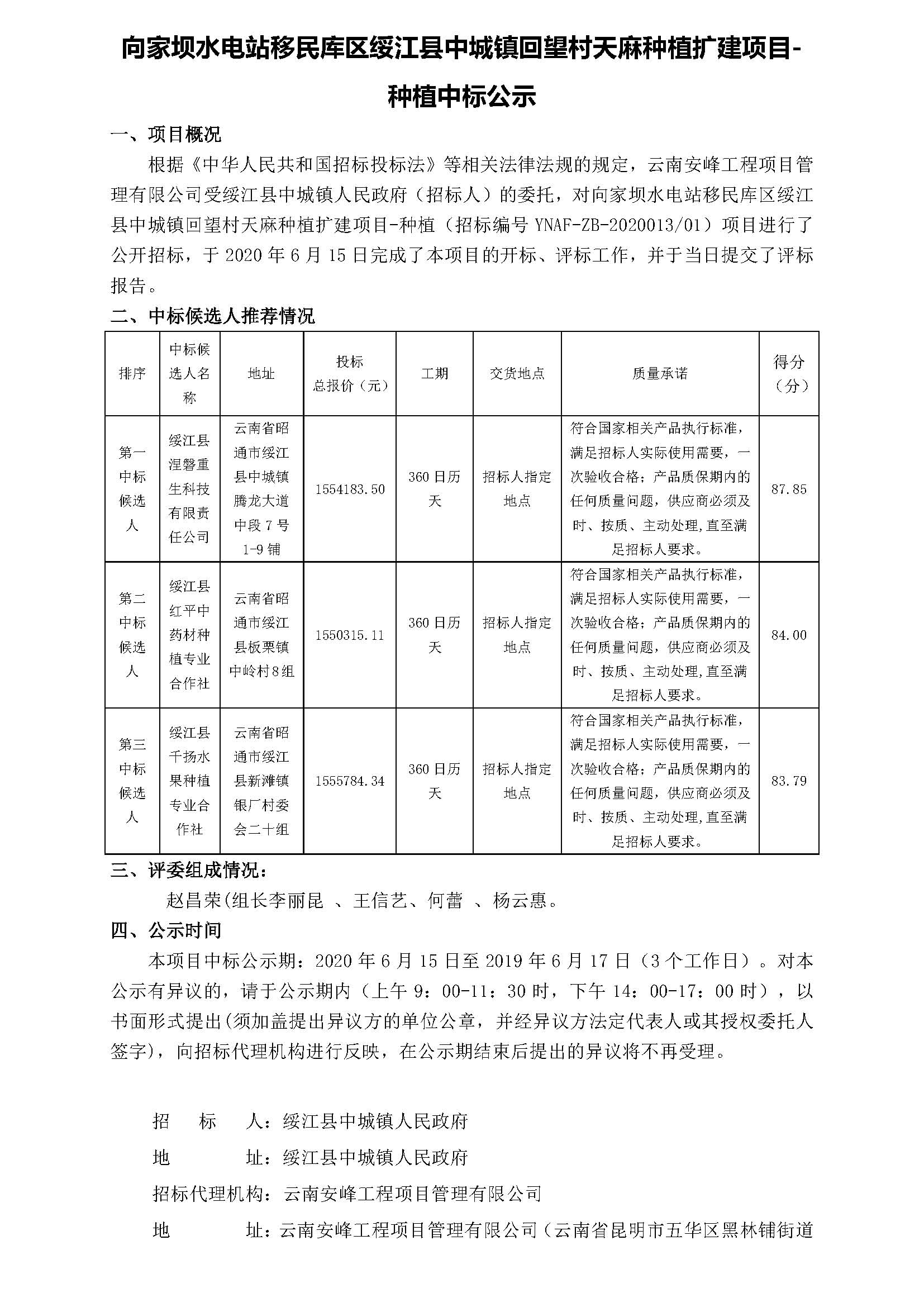 向家壩水電站移民庫區綏江縣中城鎮回望村天麻種植擴建項目-種植中標公示