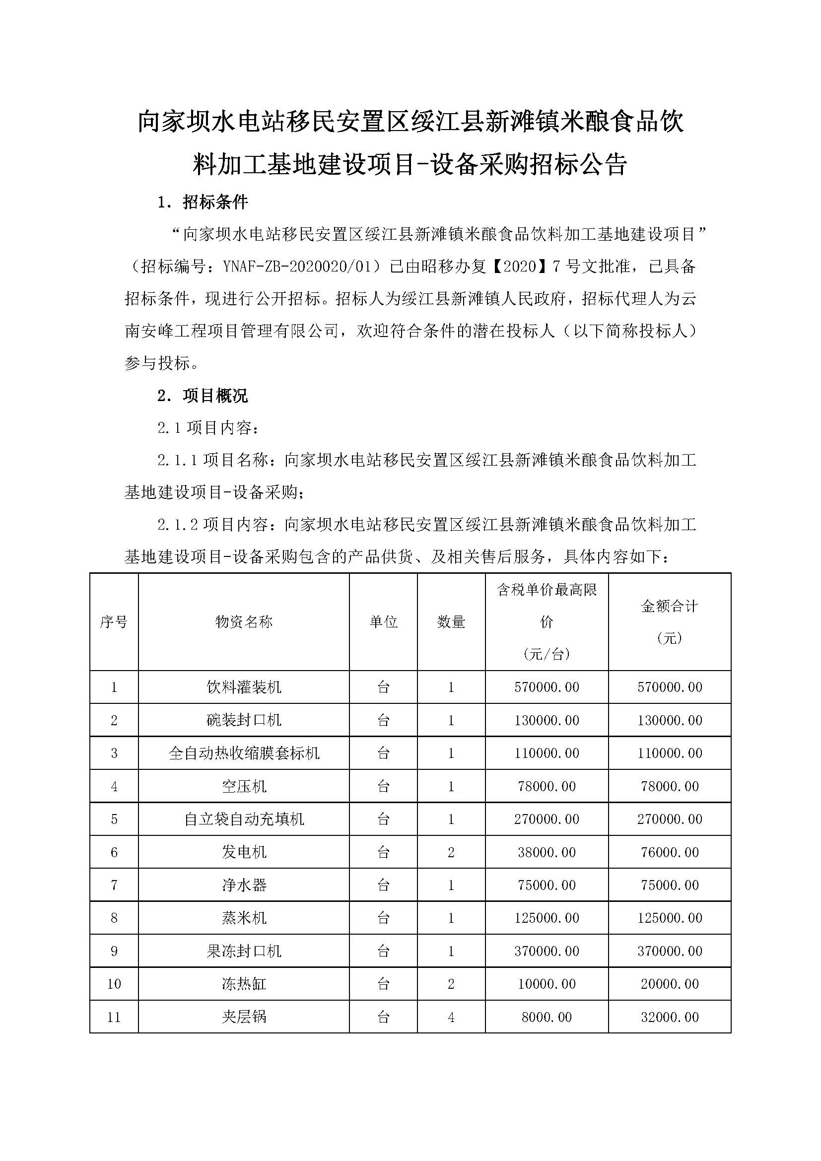 向家壩水電站移民安置區綏江縣新灘鎮米釀食品飲料加工基地建設項目-設備采購招標公告