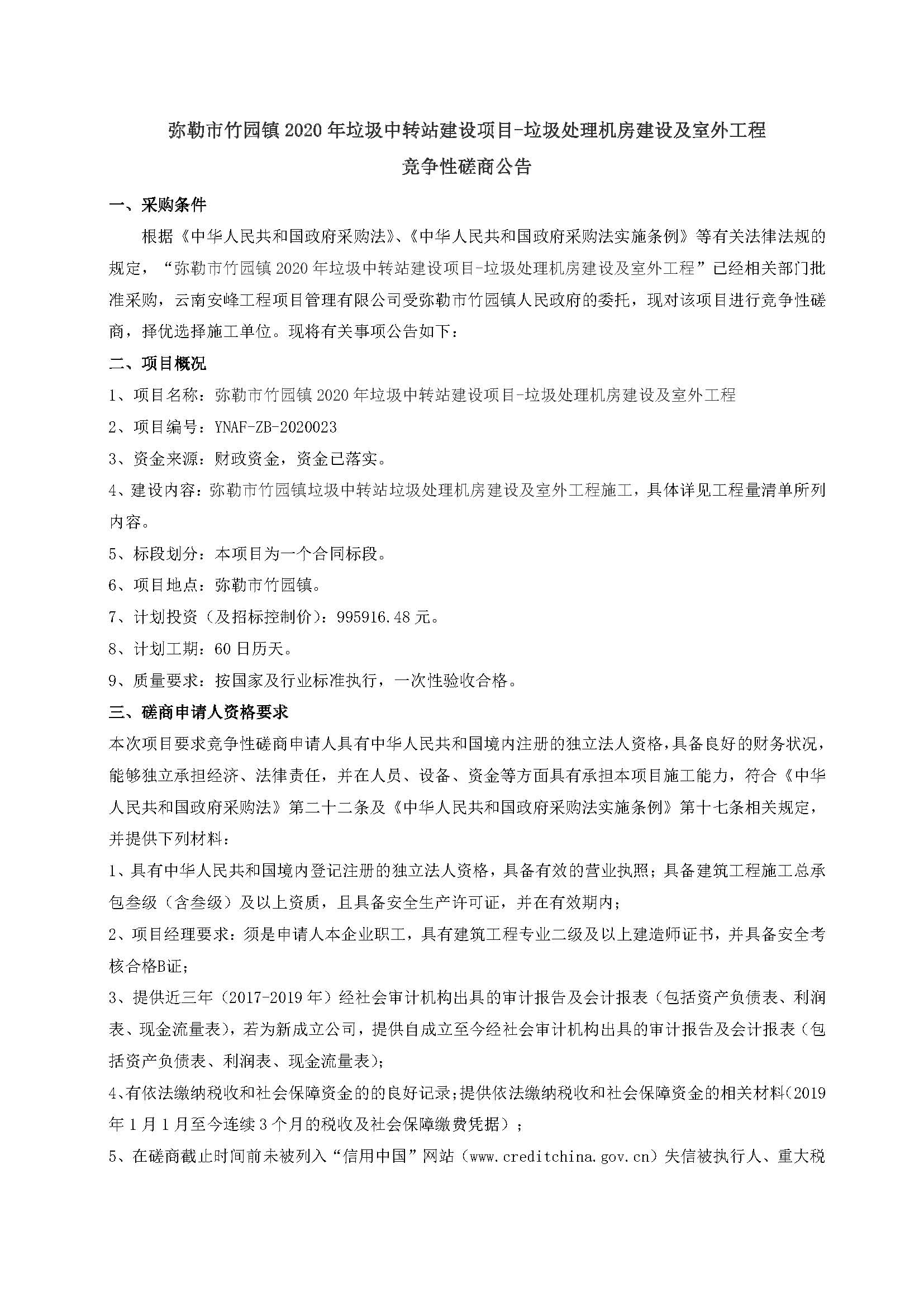 彌勒市竹園鎮(zhèn)2020年垃圾中轉(zhuǎn)站建設(shè)項目-垃圾處理機房建設(shè)及室外工程 競爭性磋商公告
