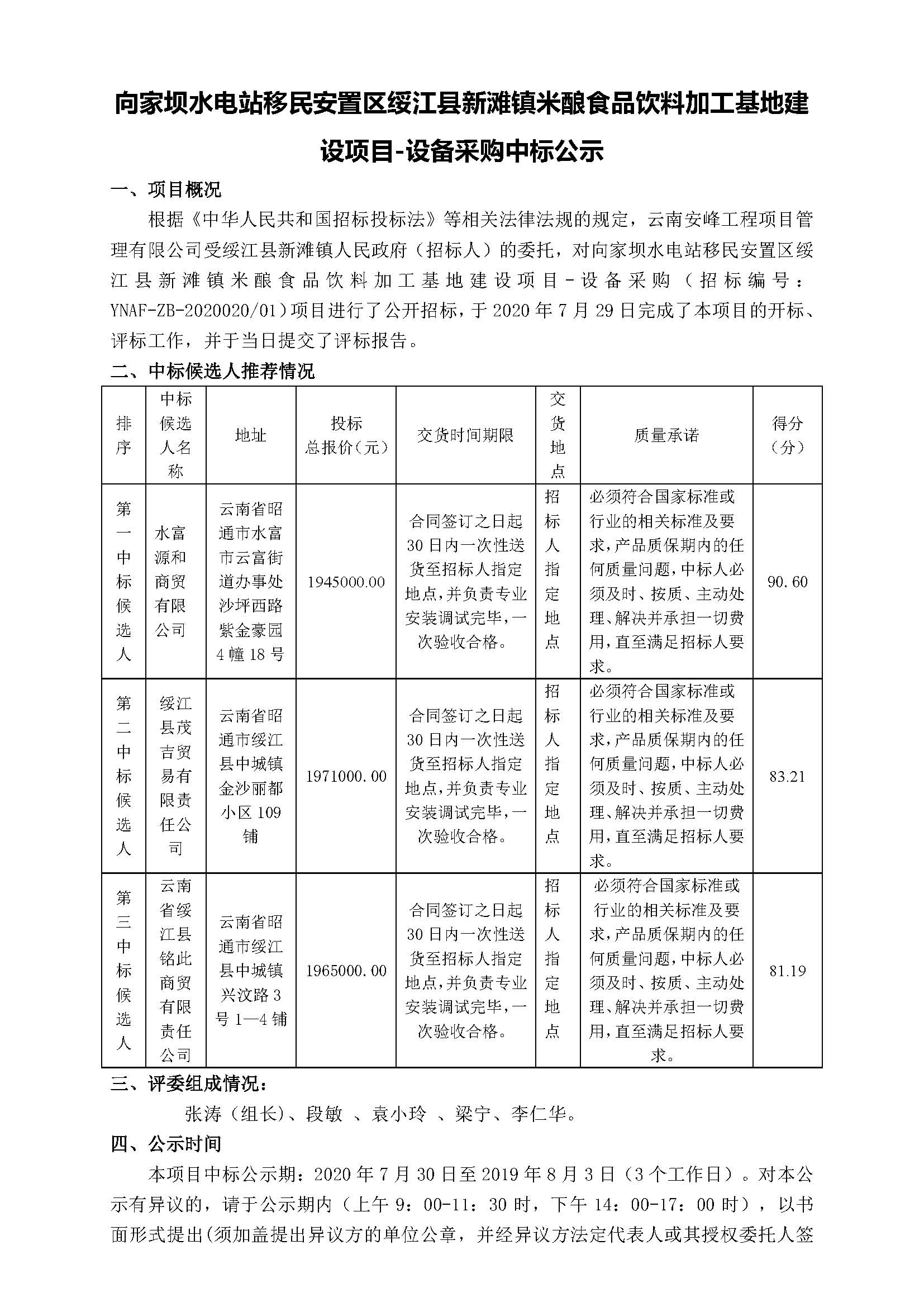 向家壩水電站移民安置區綏江縣新灘鎮米釀食品飲料加工基地建設項目-設備采購中標公示