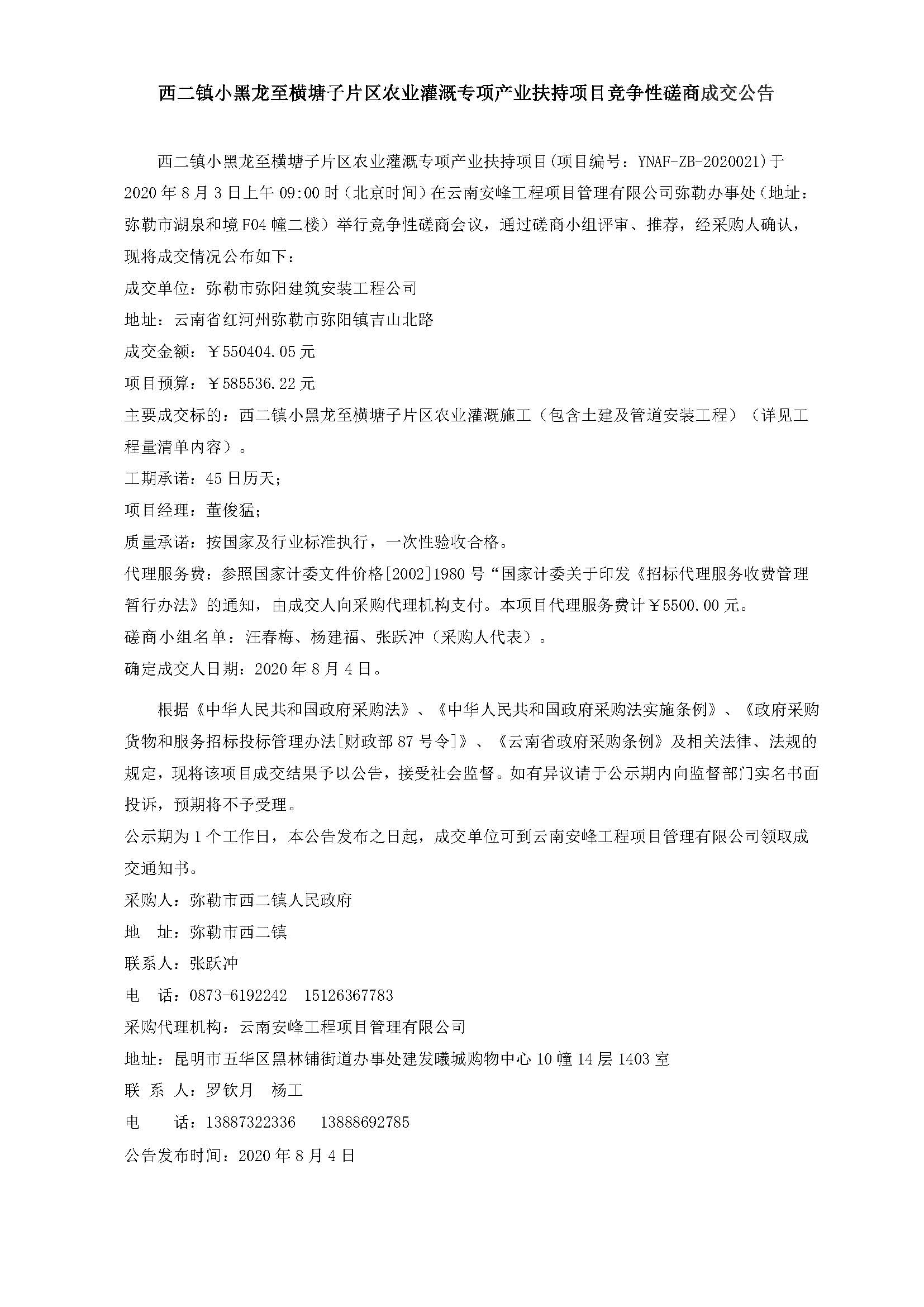 西二鎮小黑龍至橫塘子片區農業灌溉專項產業扶持項目競爭性磋商成交公告