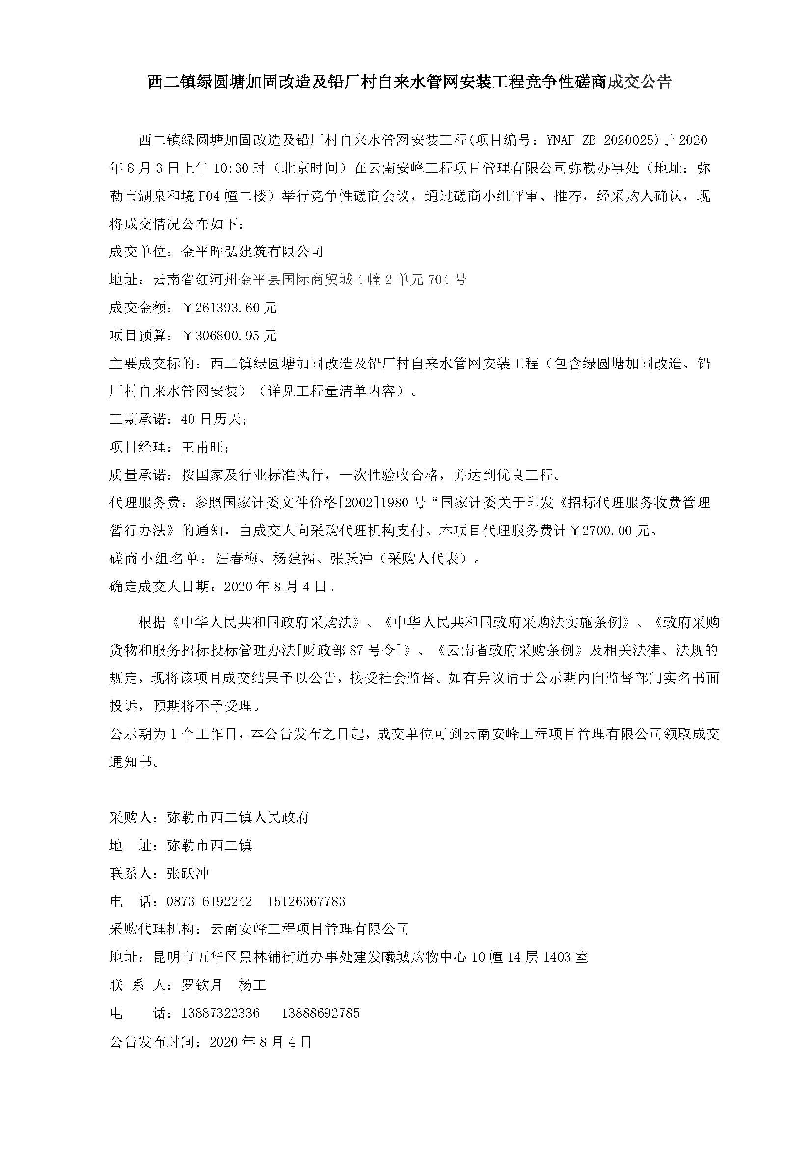 西二鎮綠圓塘加固改造及鉛廠村自來水管網安裝工程競爭性磋商成交公告