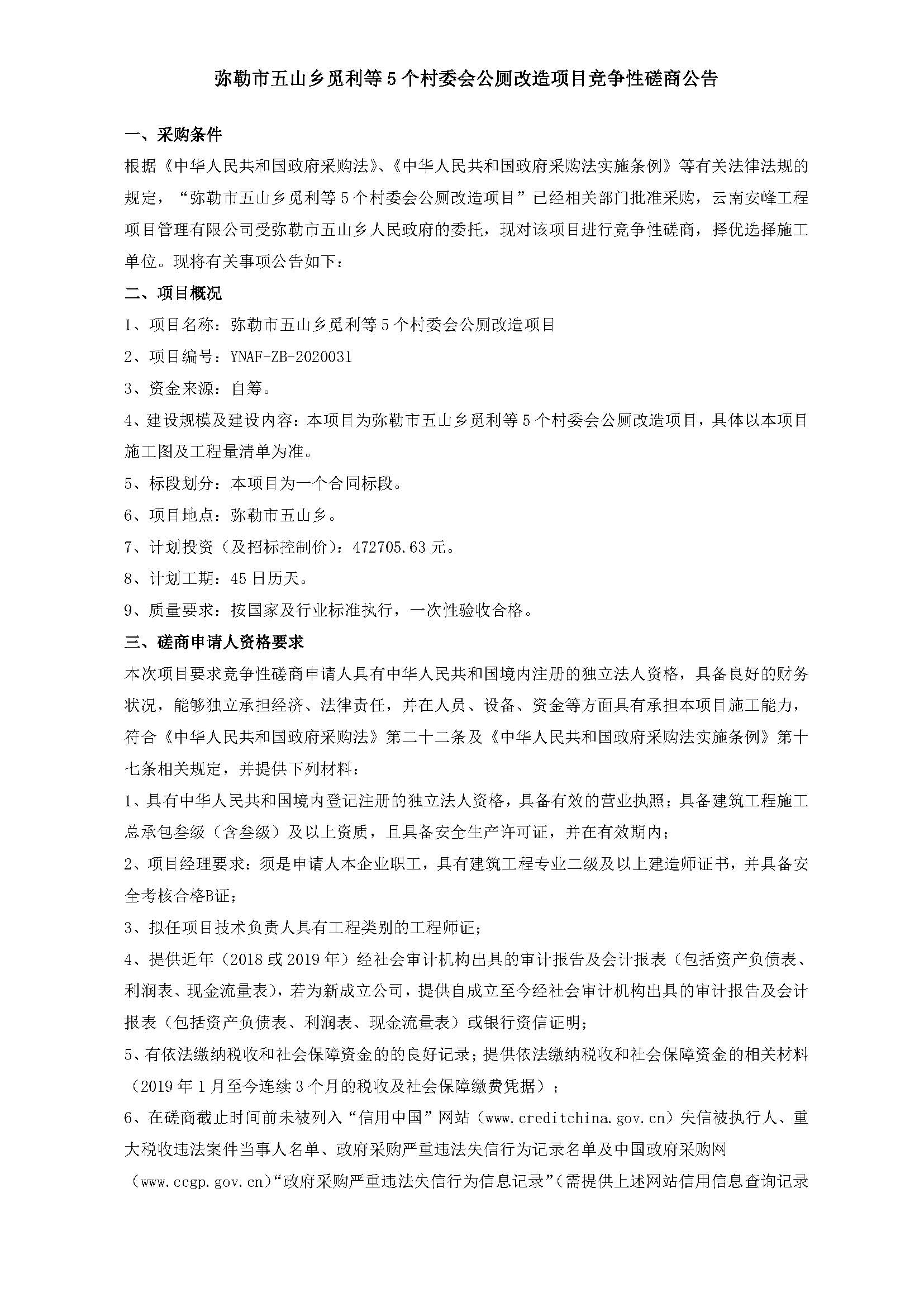 彌勒市五山鄉(xiāng)覓利等5個村委會公廁改造項(xiàng)目競爭性磋商公告