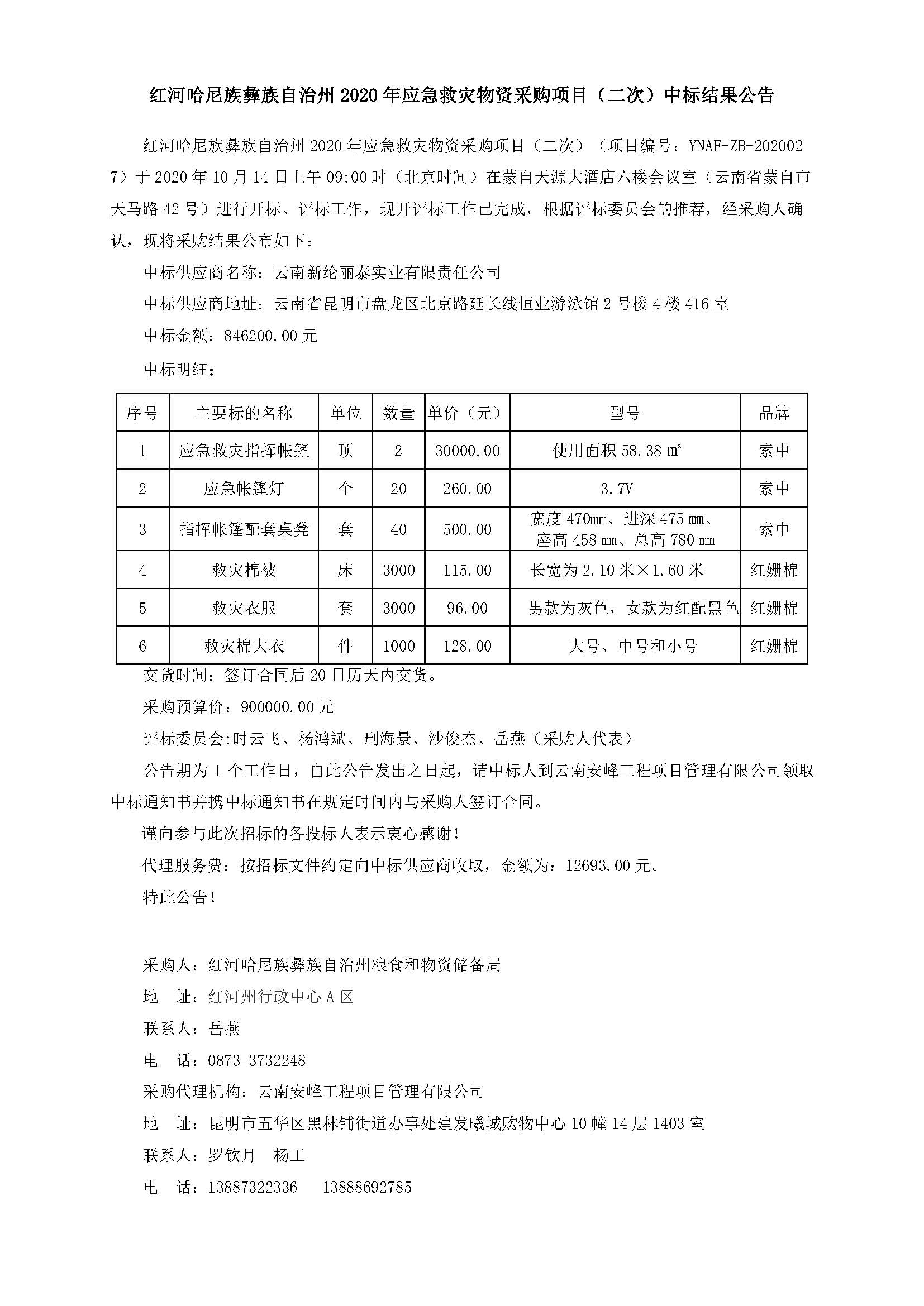 紅河哈尼族彝族自治州2020年應急救災物資采購項目(二次)中標結果公告