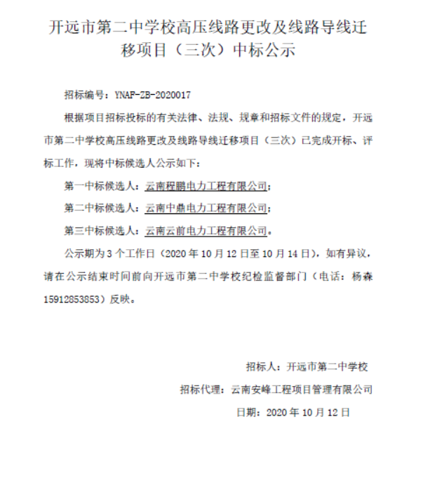 開遠市第二中學校高壓線路更改及線路導線遷移項目(三次)中標公示
