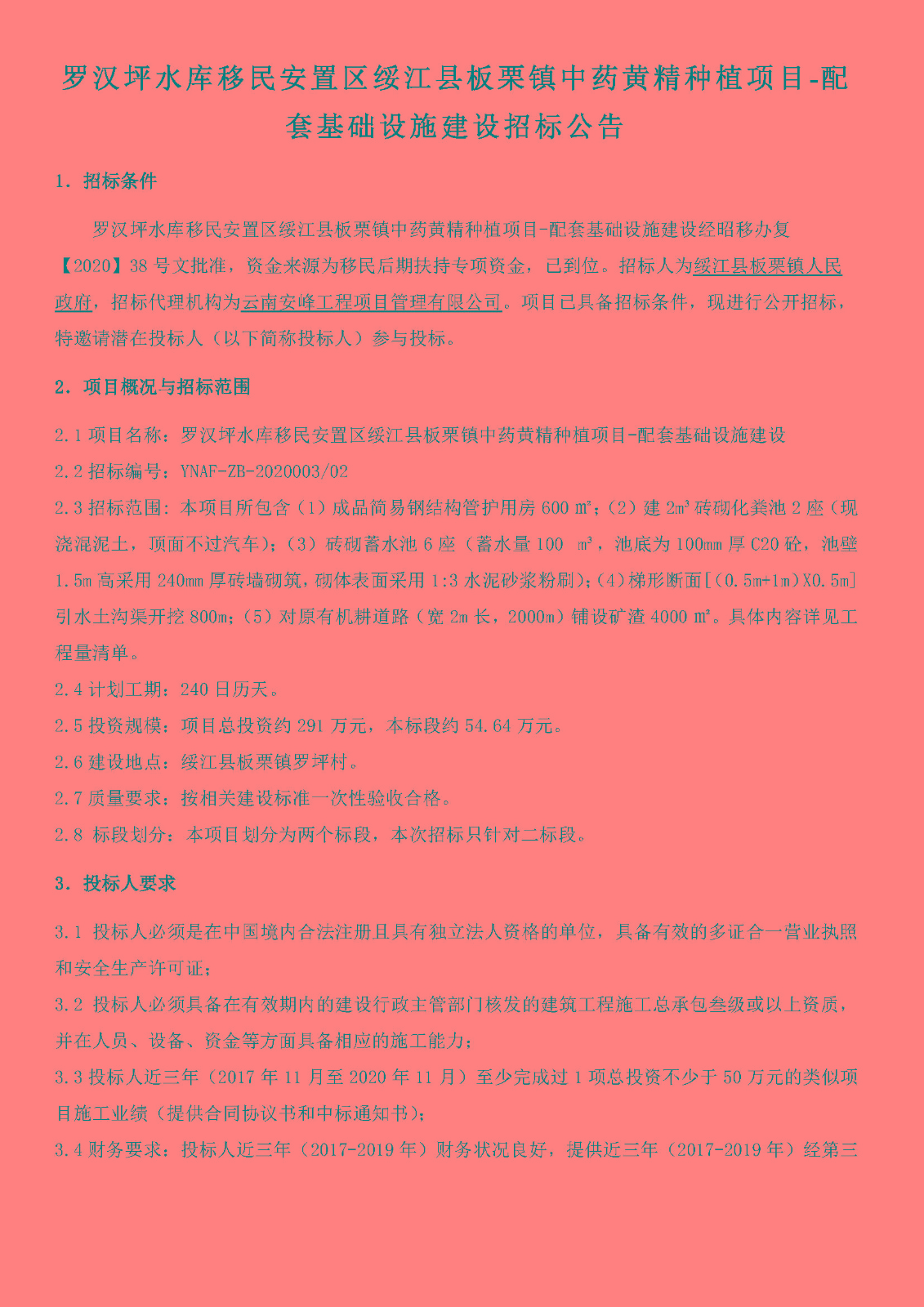 羅漢坪水庫移民安置區綏江縣板栗鎮中藥黃精種植項目-配套基礎設施建設招標公告