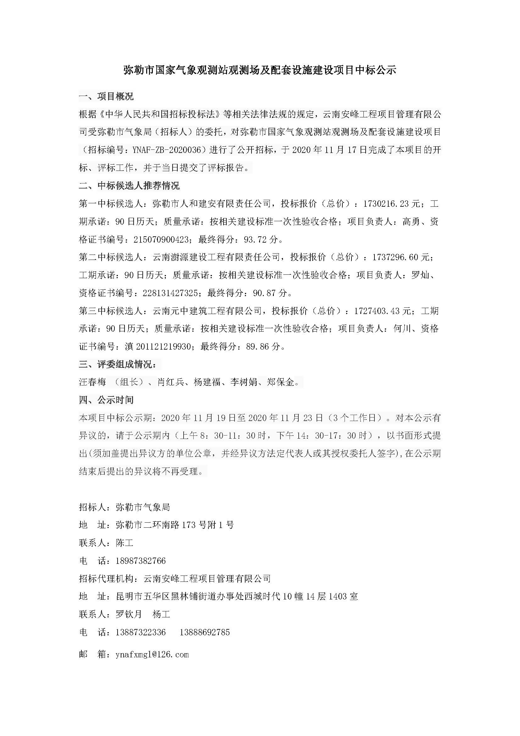 彌勒市國家氣象觀測站觀測場及配套設施建設項目中標公示